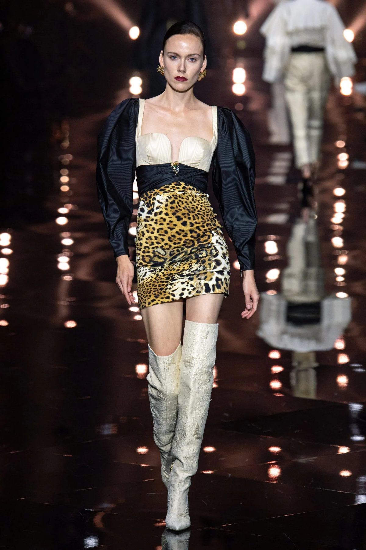 不論是 Roberto Cavalli 的刺繡、David Koma 的七彩的西方版本,或是 Tom Ford的Disco 平底鞋、Off-White和Alexander McQueen 的電單車風格,以及Valentino 如 second skin 的透視亮片設計——就像最時尚的A-list 明星最愛的派對造型,天橋上的造型也證明了這些靴款適合配搭迷你裙裝,以及一份大膽的時尚態度。