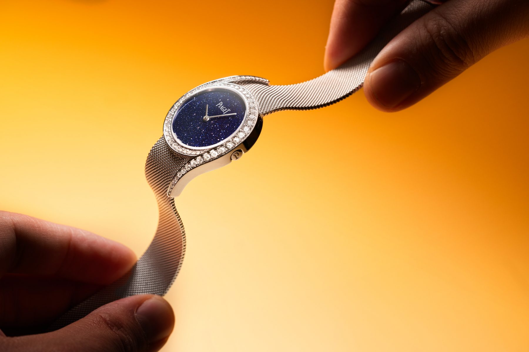而在錶鏈方面則完美展現了伯爵的匠心工藝和創意奢華的風格,以砂金石和鑽石搭配成精緻的白金米蘭網織錶鏈,由八位以上的工匠,透過靈巧的手腕,花上逾100小時將一縷金線,製成螺旋狀並編織在一起,形成柔軟的黃金織物,不僅穿戴舒適且具有出色的彈性,從錶鏈上再次見證伯爵一絲不苟的設計。