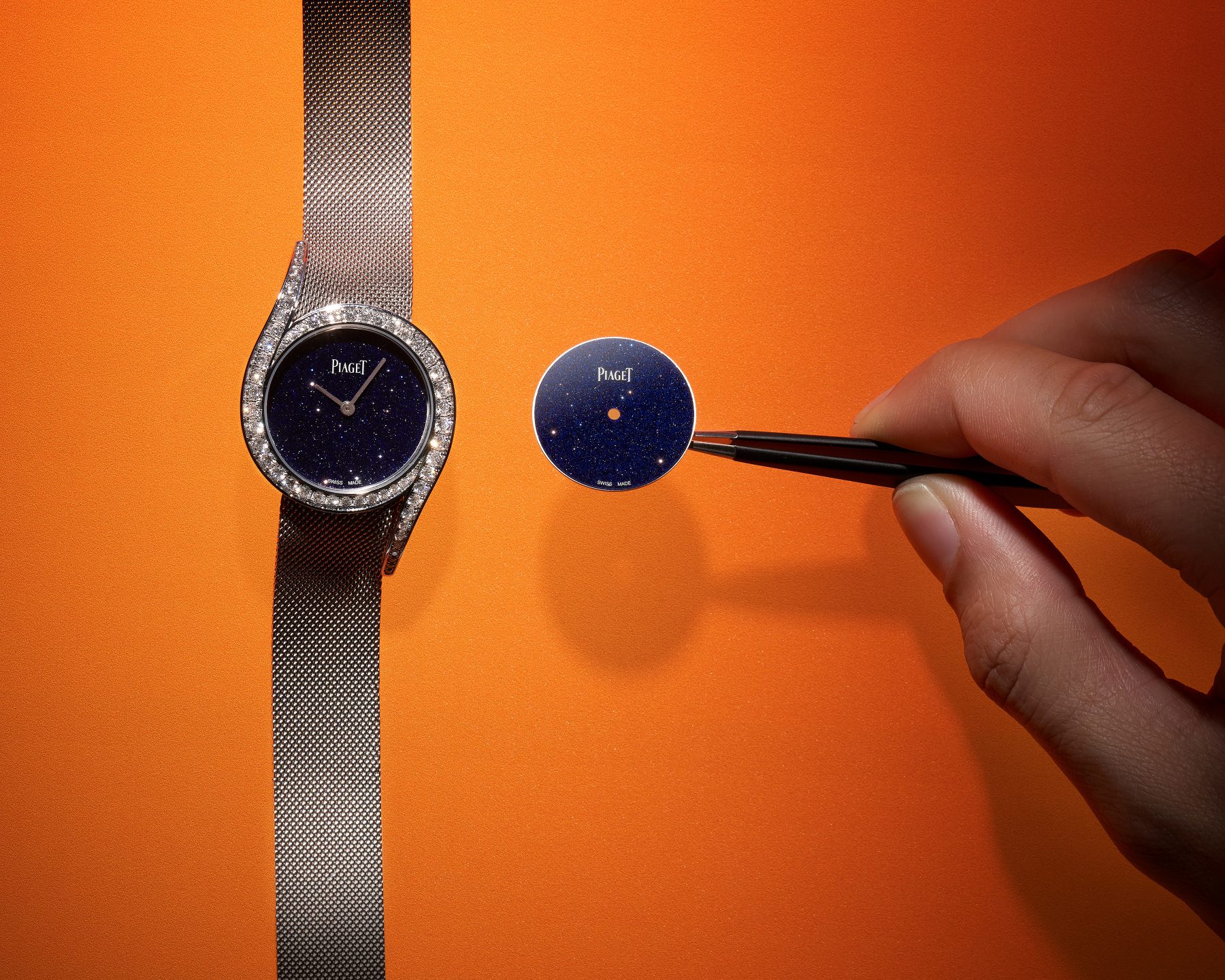 星空一向是伯爵的靈感泉源之一,從過往不少的腕錶系列中也可看到伯爵如何運用寶石及其他材質,將星空的美態呈現在錶盤之上。而 Limelight Gala Aventurine 系列也不例外,藍色砂金石水晶玻璃錶盤是透過砂金石添加氧化銅,令玻璃能模仿銀河中星光閃耀的景象,讓人有置身繁星之中的感覺,「Aventurine」在義大利文中的有「探險」的意思,而伯爵以此作名,則寓意踏入充滿神秘感的夜空中。