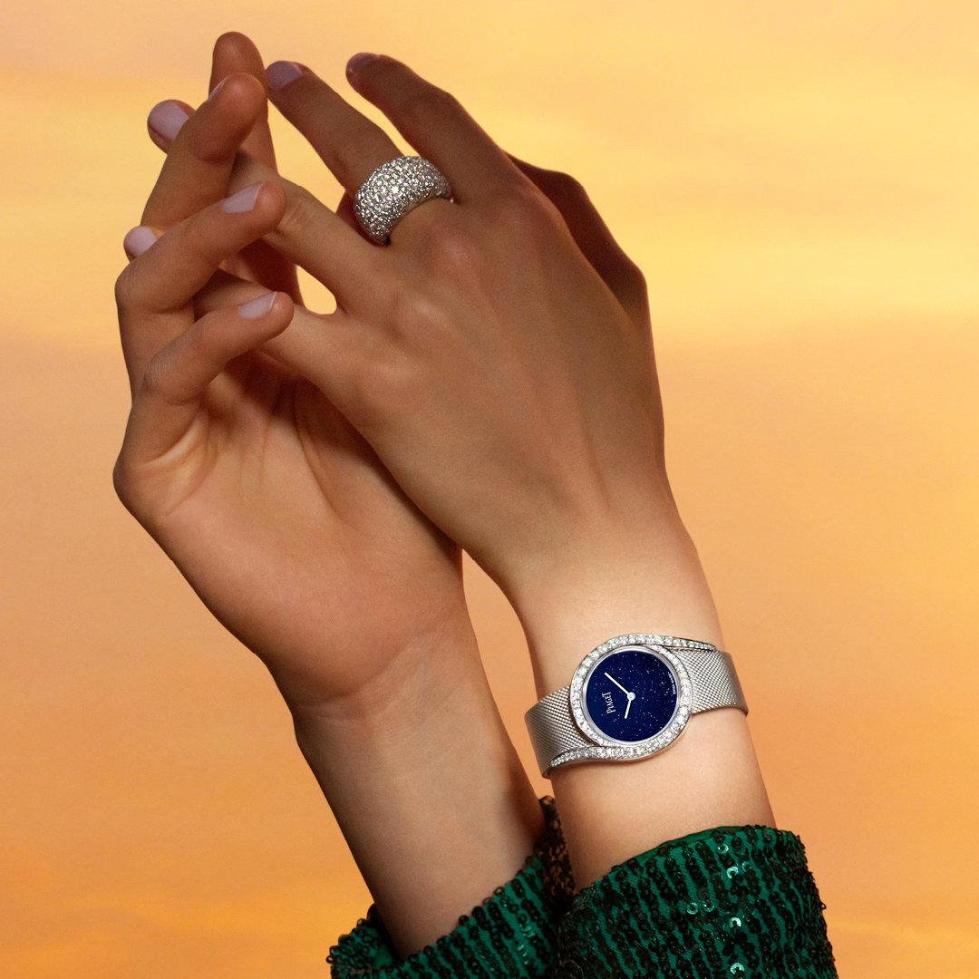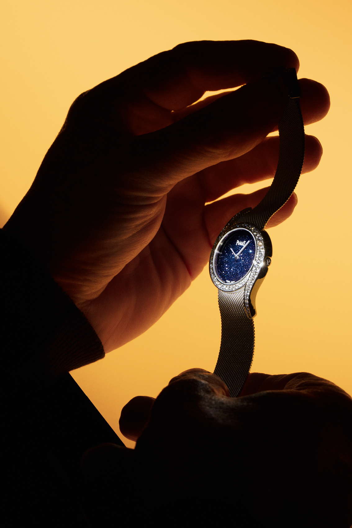 而 Limelight Gala Aventurine 系列另一特別之處,除了將星空的意念完美融入到錶盤中,更延伸至錶鏈和錶耳上,再次印證伯爵無邊的想像力。而系列最注目的,當然就是從 32 毫米的白金錶殼上下延伸的錶耳,從兩邊延伸渦狀造型的錶耳上鑲嵌著 62 顆鑽石, 展現出工匠們靈巧的手腕,同時與錶盤上的星空互相輝映。值得一提的,是伯爵早於1970年代為 Piaget Society 已創作出帶有加長錶耳的珠寶腕錶,無疑是系列的設計藍本,早於多年前已奠定其柔美經典的地位,難怪伯爵一直被稱為優雅的代表。