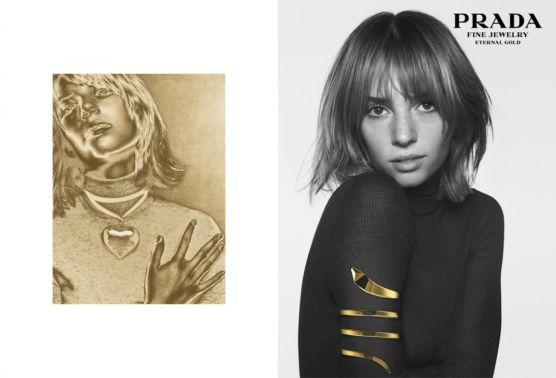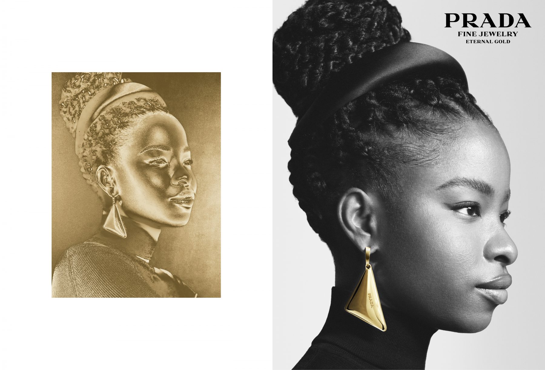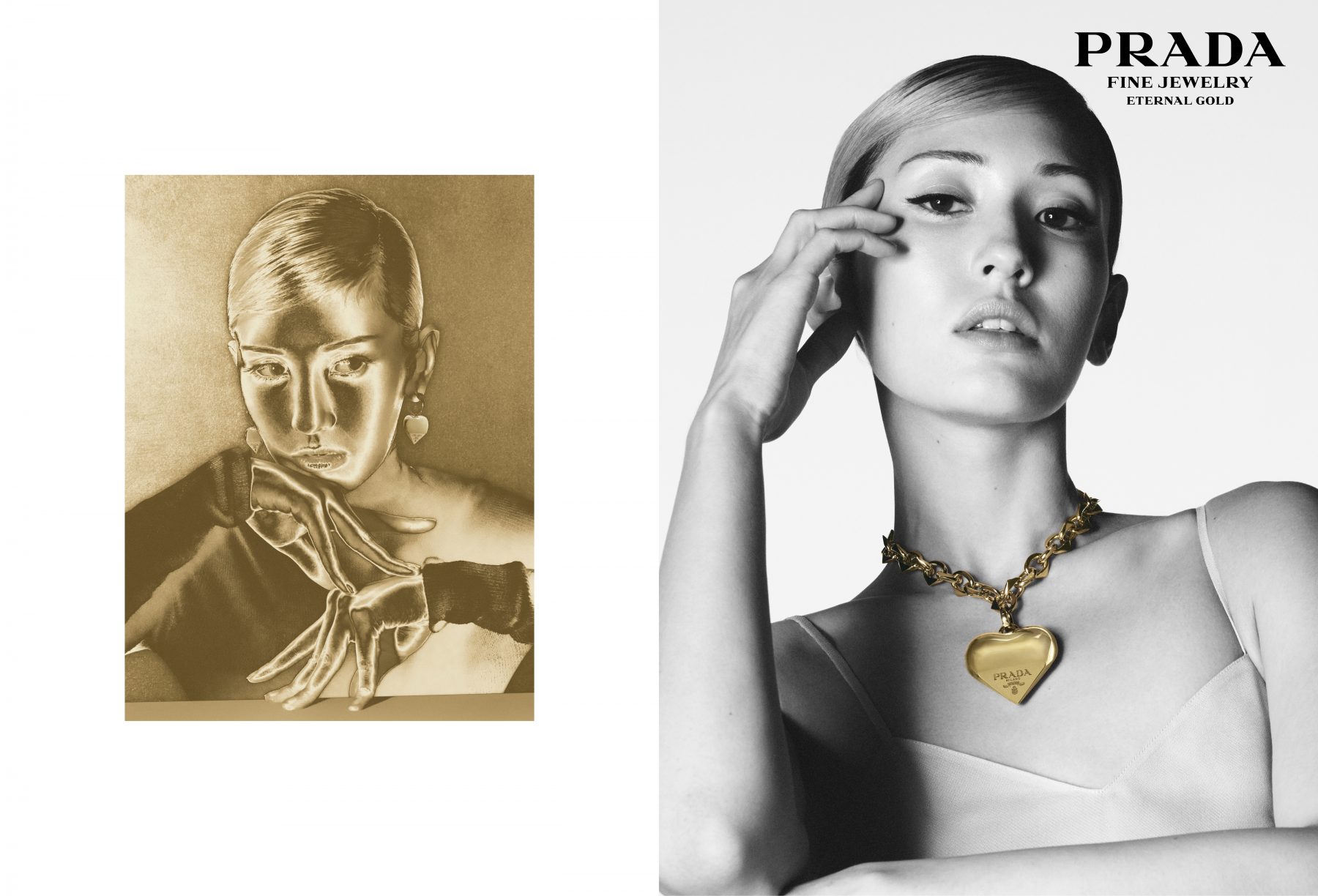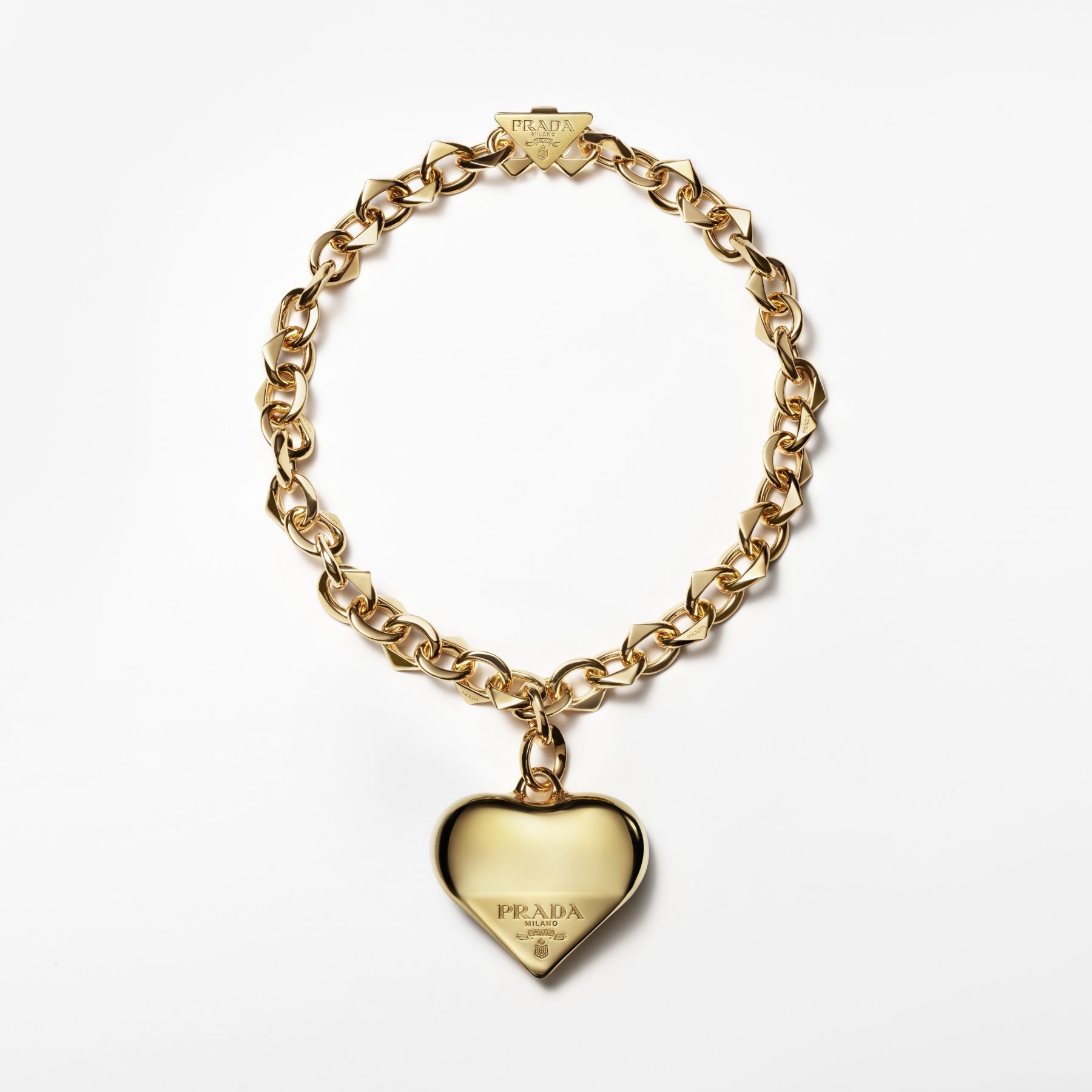 Eternal Gold 系列各款厚實的金色單品亦體現了 Prada 的極簡美學,同時又以象徵品牌的 Prada 三角形標誌為軸心,引用了蛇形手鐲、心形圖案等經典珠寶輪廓,又以誇大輪廓的吊墜及鍊圈重新定義比例,塑造出當代高級珠寶的廓形。而系列每件作品均綴有象徵 Prada 的三角形,以呼應與鑽石的切割面。