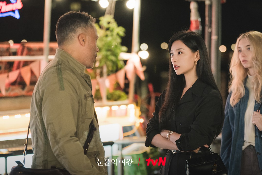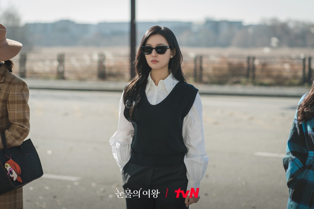 將金秀賢帶入豪門後,金智媛再也不掩飾其豪門身份,作為集團 CEO 的她在造型上也有所轉變,肩墊西裝與黑色單品成為她的不二之選,有時候她還會將西裝披在肩上,以營造威勢。另外,她在花紋上也有所考究,Alexander McQueen 的眼球圖案西裝,以及 Veronica Beard 的蛇皮套裝不僅款式張揚出眾,也把角色的霸氣表露無遺。