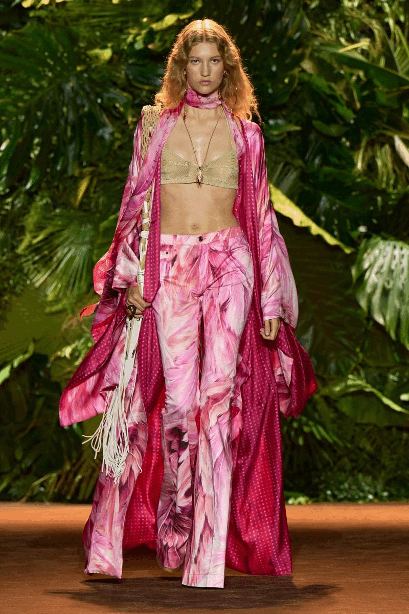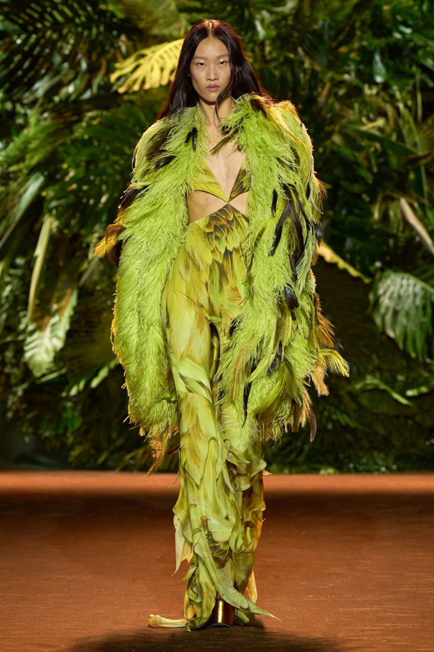 Roberto Cavalli品牌誕生於義大利佛羅倫斯,以其獸紋印花、性感剪裁和奢華材質而聞名。在期待已久的Roberto Cavalli 2024春夏系列中,設計師Fausto Puglisi將我們帶到陽光明媚的棕櫚樹林,場地被綠意盎然的植物裝飾著。