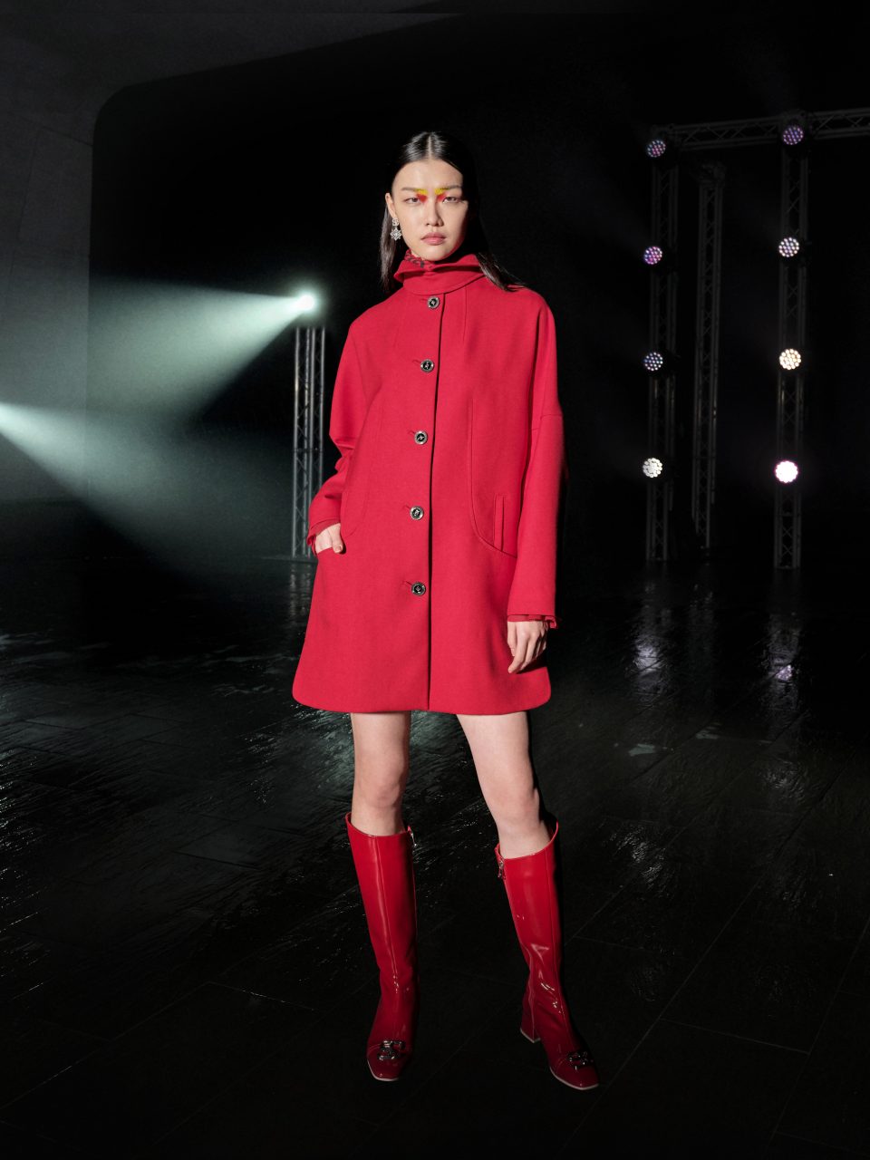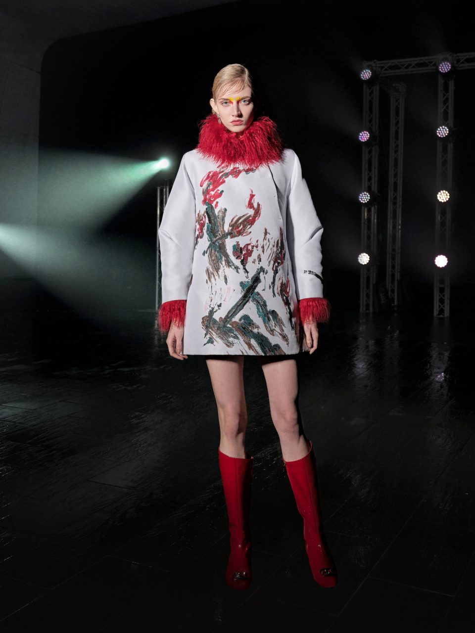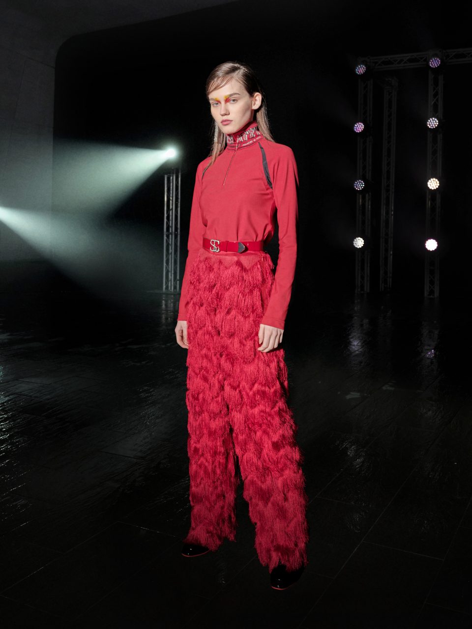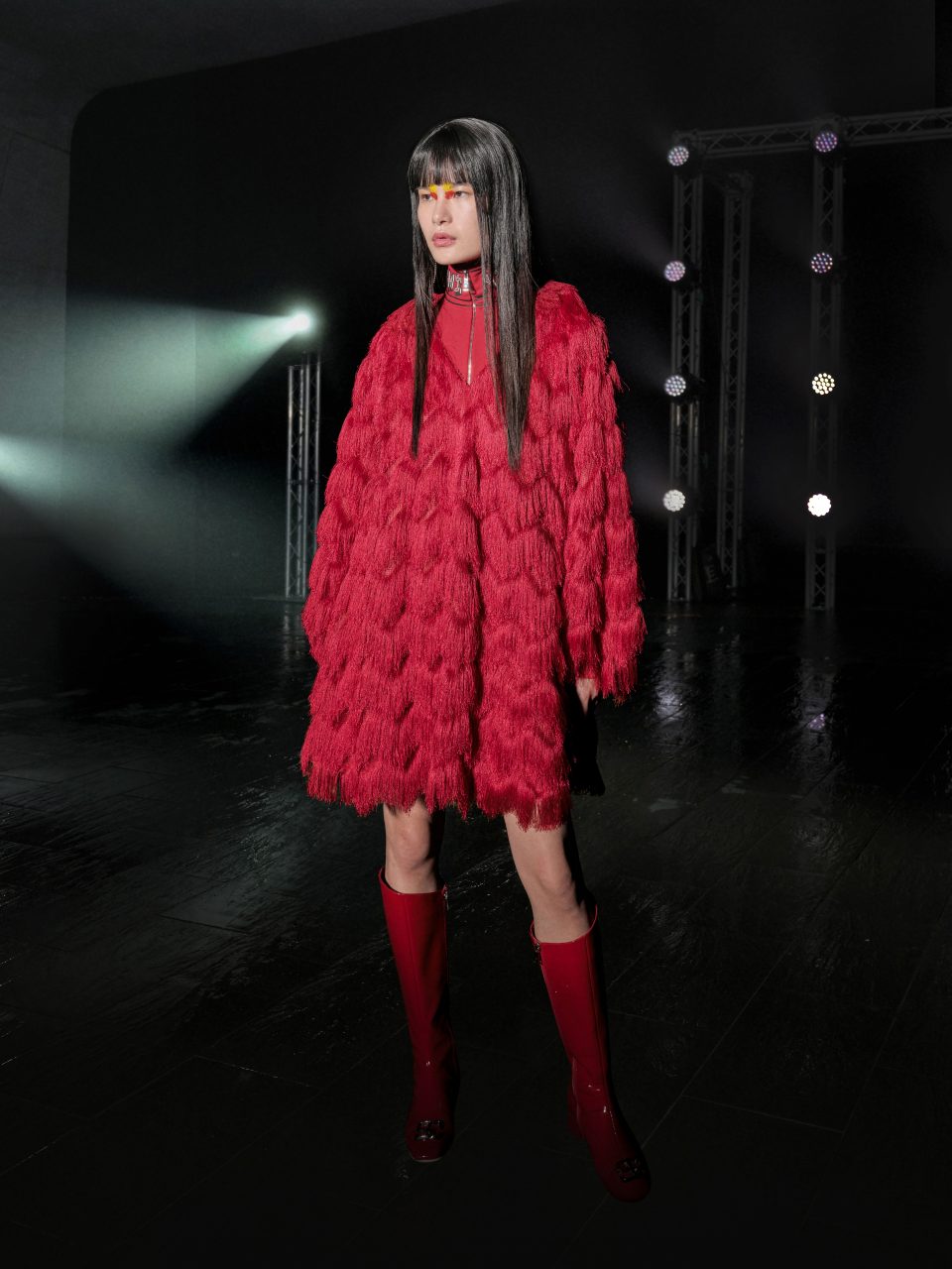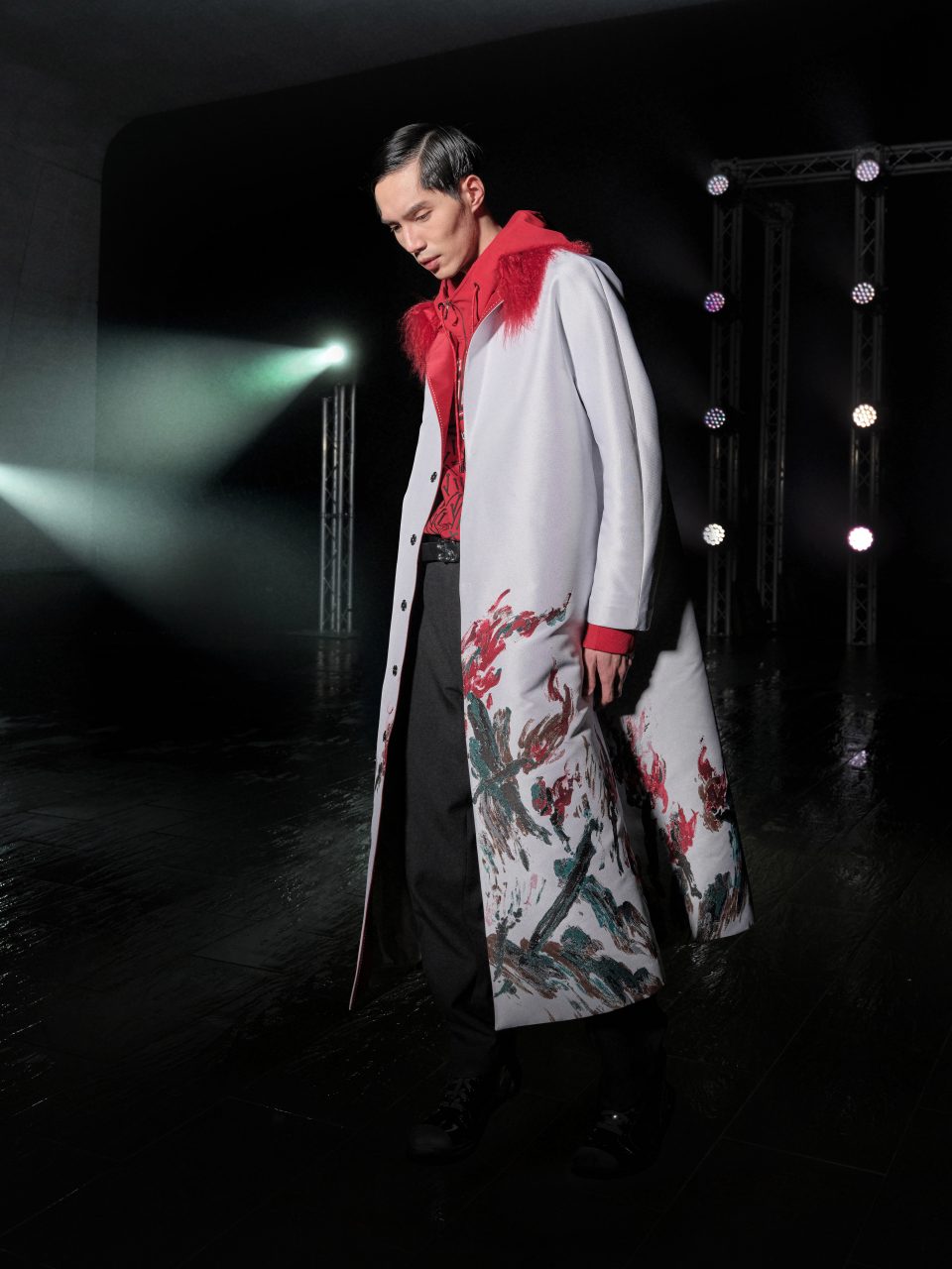 而在設計方面,系列固然貫徹品牌獨有美學,將東西方之美結合為一,而新系列其中一大獨特之處,當然是將腦海中抽象的畫面,透過服裝呈現眼前。先以全紅貼身上衣配搭立體流蘇闊褲作引指;再以紅色H-Line長褸配搭紅色長靴,Tone on Tone的配搭,猶如在黑暗中點燃的火把;全白長裙造型則象徵着光和煙火;最後再以大量黑色為主色調的造型,以不同的布料配搭立體亮片、羽毛飾物,以詮釋暗黑中光影的繚繞。