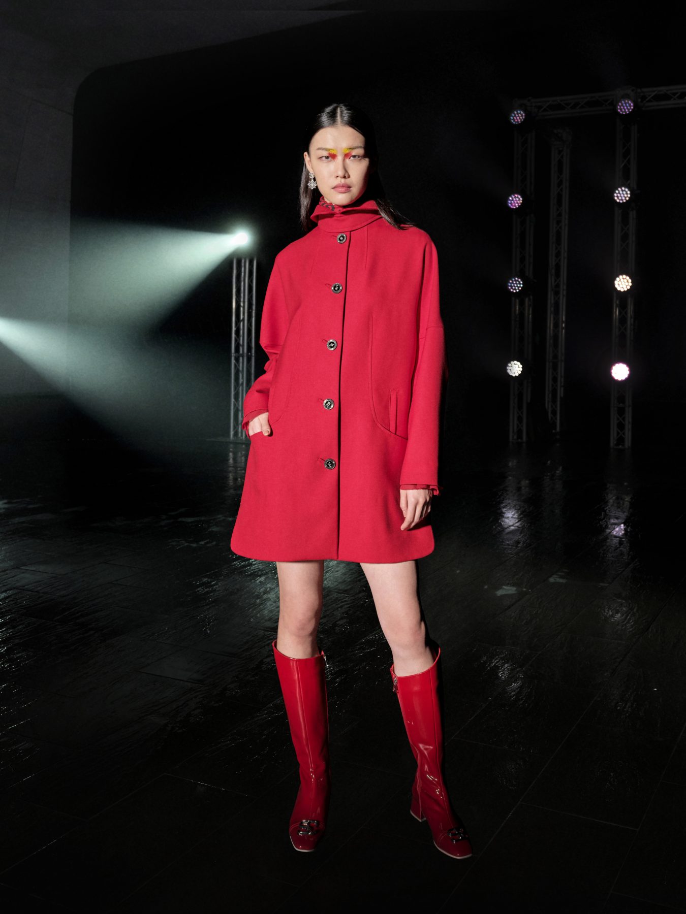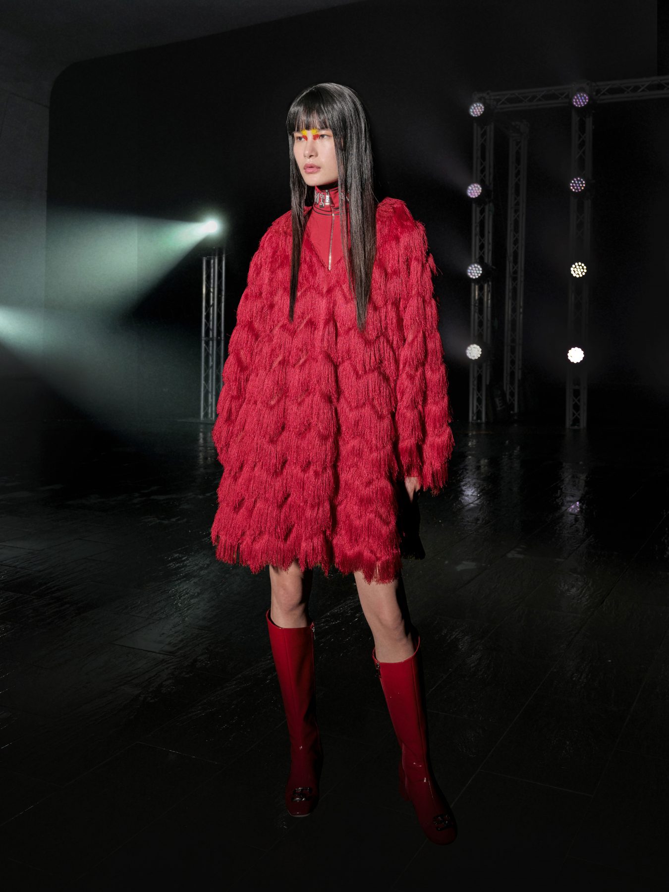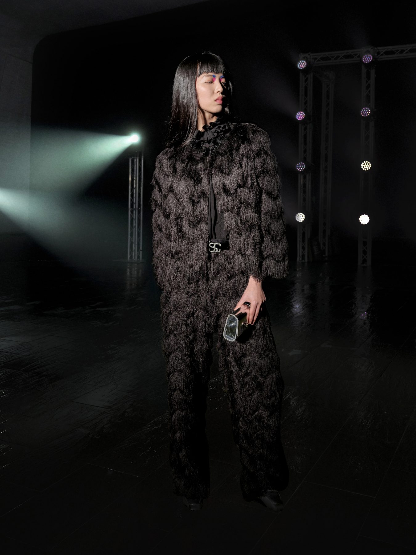 而在設計方面,系列固然貫徹品牌獨有美學,將東西方之美結合為一,而新系列其中一大獨特之處,當然是將腦海中抽象的畫面,透過服裝呈現眼前。先以全紅貼身上衣配搭立體流蘇闊褲作引指;再以紅色H-Line長褸配搭紅色長靴,Tone on Tone的配搭,猶如在黑暗中點燃的火把;全白長裙造型則象徵着光和煙火;最後再以大量黑色為主色調的造型,以不同的布料配搭立體亮片、羽毛飾物,以詮釋暗黑中光影的繚繞。