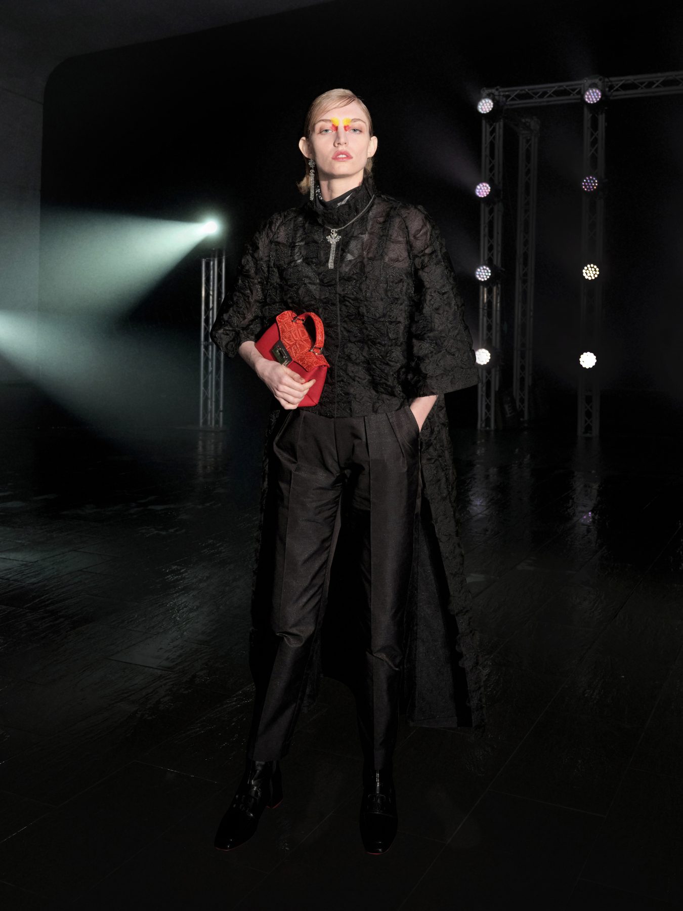 品牌更多次從細節中再次呼應主題,包括系列圖騰以火光、硝煙與燃光及霓虹光暈為元素,代表着光輝燦爛的起源,並將其加入至男女的衣服及飾物設當中;對稱的放射狀水晶耳環仿如光的折射;以具光彩反射的全漆皮材質設計而成的鞋款,無一不緊扣着光塵主題。