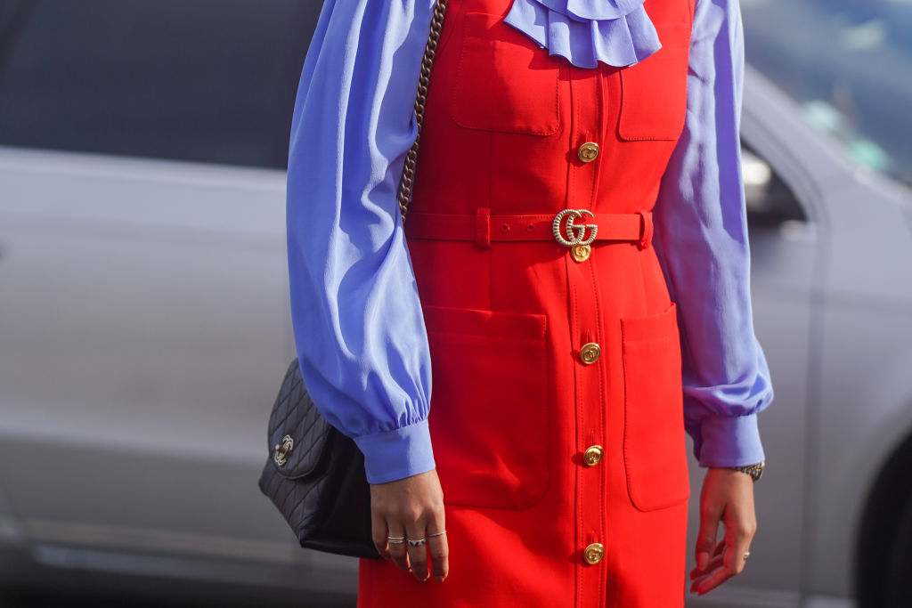 PARIS, FRANCE - MARCH 03: A guest wears a red Gucci belt, purple ruffled shirt, a red dress with golden buttons, outside Chanel, during Paris Fashion Week - Womenswear Fall/Winter 2020/2021 on March 03, 2020 in Paris, France. (Photo by Edward Berthelot/Getty Images)