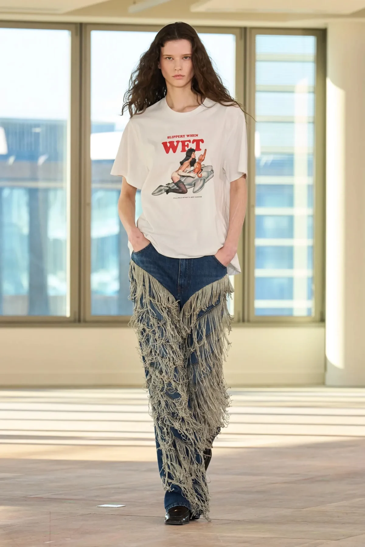 另一方面,社交平台的發展讓時尚變得更加視覺化與碎片化。一件有趣的 Slogan Tee 更容易在社交平台上脫穎而出,成為搶眼的視覺焦點。它不只傳達文字,更透過字體、排版與設計語言,構成強烈的圖像感染力。與此同時,Y2K 風潮回歸也推動了 Slogan Tee 的復興。早於九十年代,Slogan Tee 便已成為反文化、音樂次文化的標配單品。如今,它挾帶復古情懷與當代語境重新登場,回應我們對簡約舒適卻不乏個性穿著的渴望。