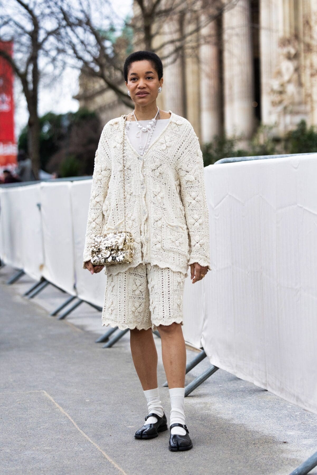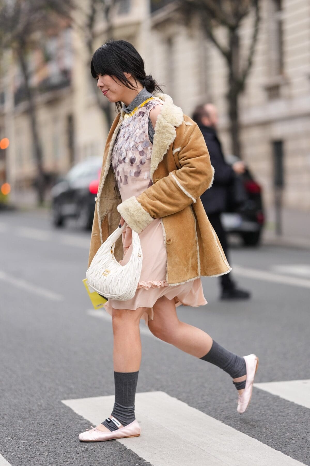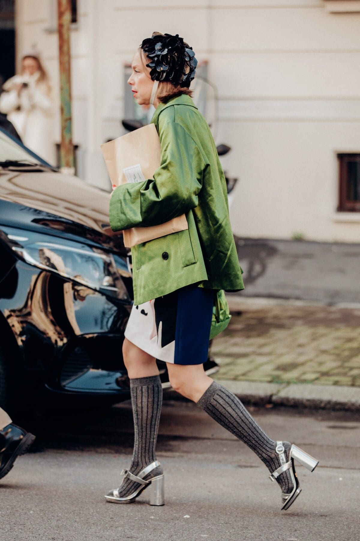 前排的明星們甚至也加入了這種造型方式。在Miu Miu 的時裝展場,Sydney Sweeney 和 Emma Corrin 穿上了品牌的及膝襪,搭配繫帶高跟鞋打造學院風造型。 Tamu McPherson、Chloe King 和 Susie Lau 等街頭時尚名人也將自己的設計師高跟鞋和芭蕾平底鞋,與厚襪或金銀絲襪搭配在一起。