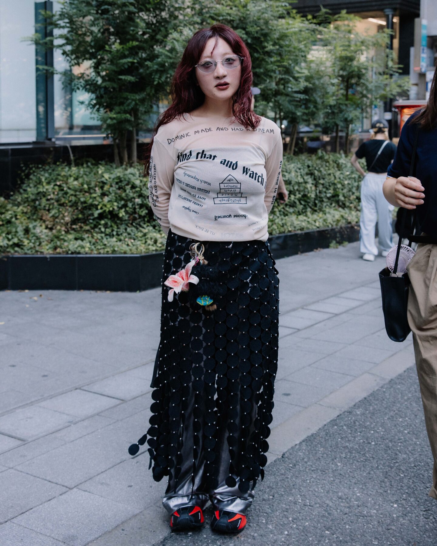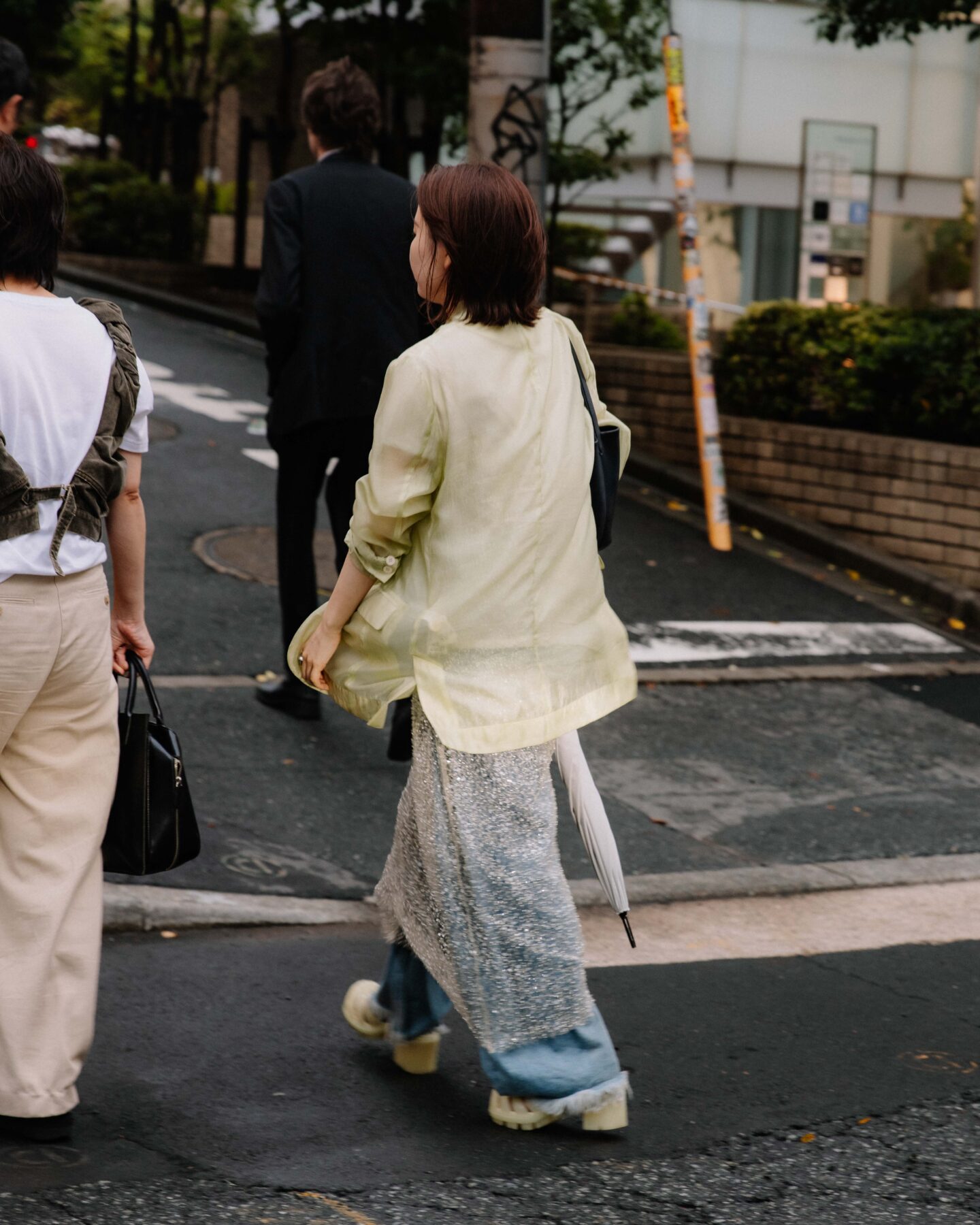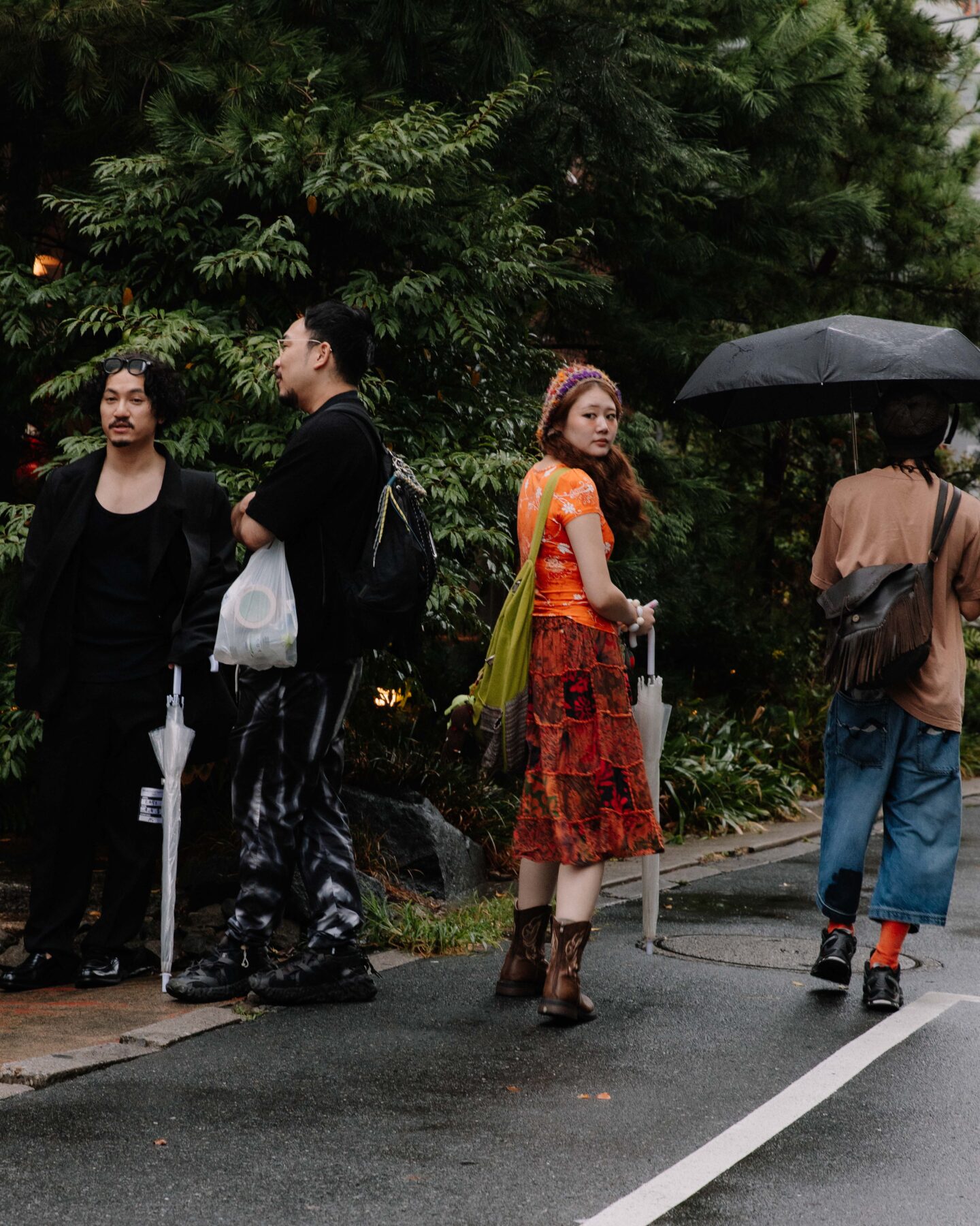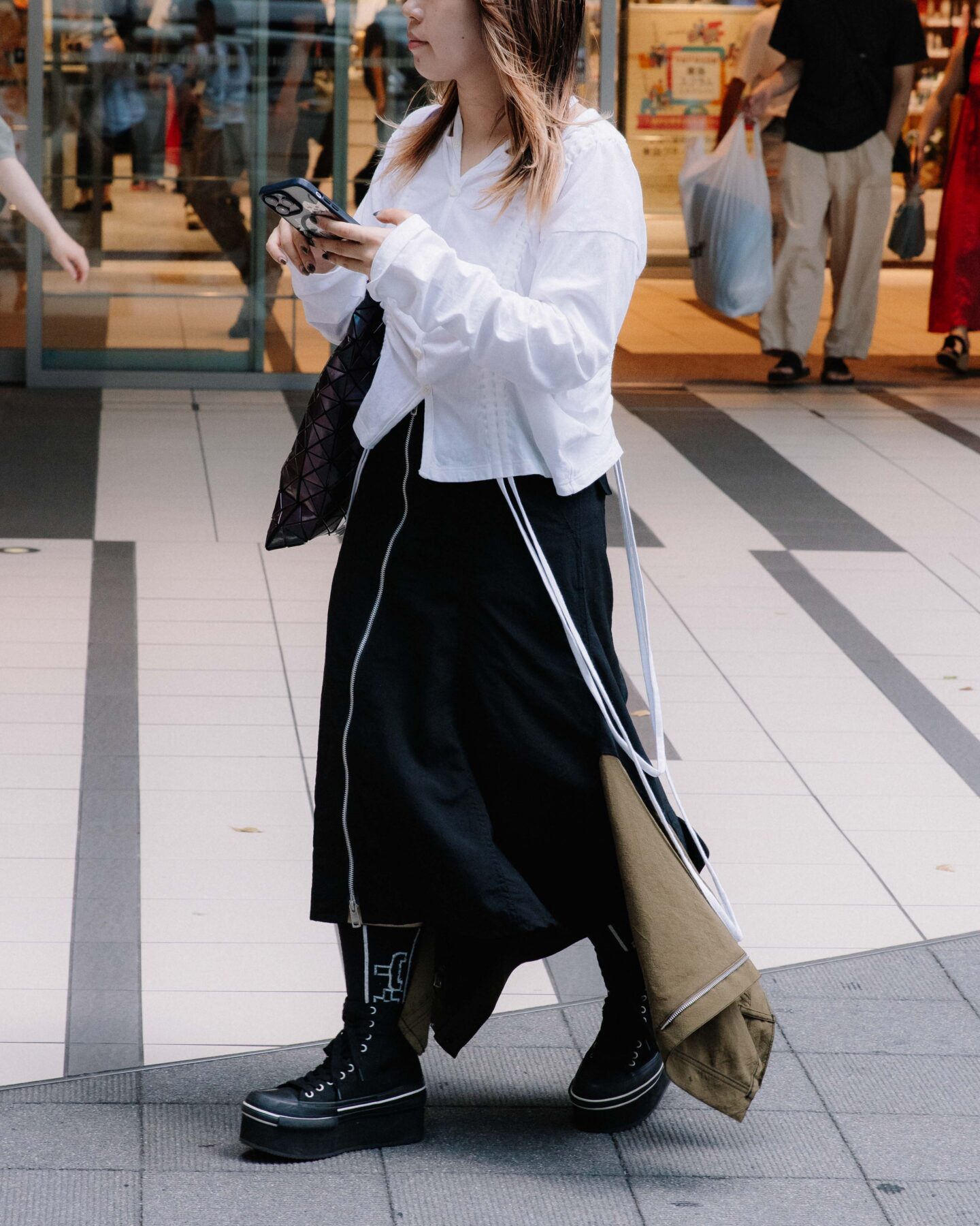 鞋履成為造型的視覺焦點,從彩色皮鞋、拼色運動鞋到解構式高跟鞋,設計皆帶有誇張比例與趣味感。鮮明的用色與不規則造型,突破功能界限,令鞋子成為街拍影像中最搶眼的細節。這種將「鞋」視為造型主角的方式,展現了東京街頭對時尚實驗的無限想像。