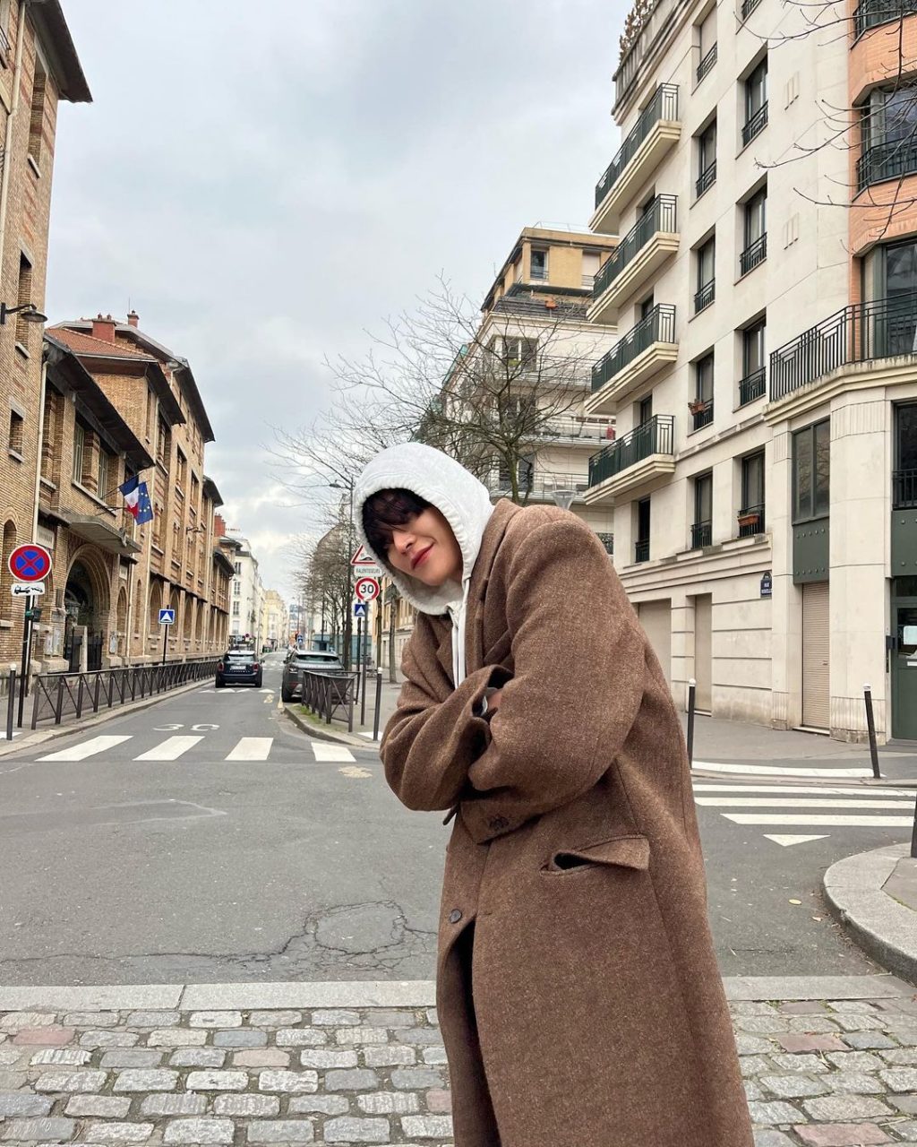 路雲私下的大衣造型更加休閒隨性,啡色大衣內襯白色連帽衛衣,一秒化身校園陽光男孩,大衣的直筒寬鬆版型更是凸顯其青春活力的一面。