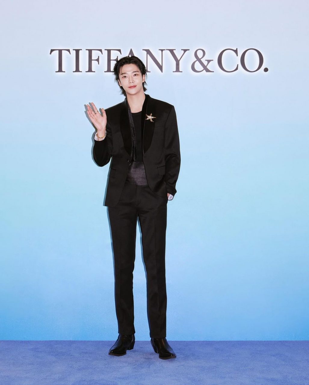 近期路雲出席Tiffany & Co.活動,他以一襲黑色西裝現身,緞面材質翻領化身貴公子,胸口前飾有金色胸針映射雋永格調,配襯黑色緊身衣勾勒完美身材。