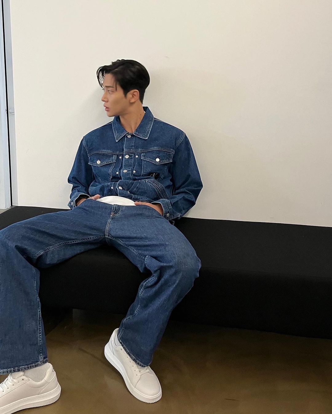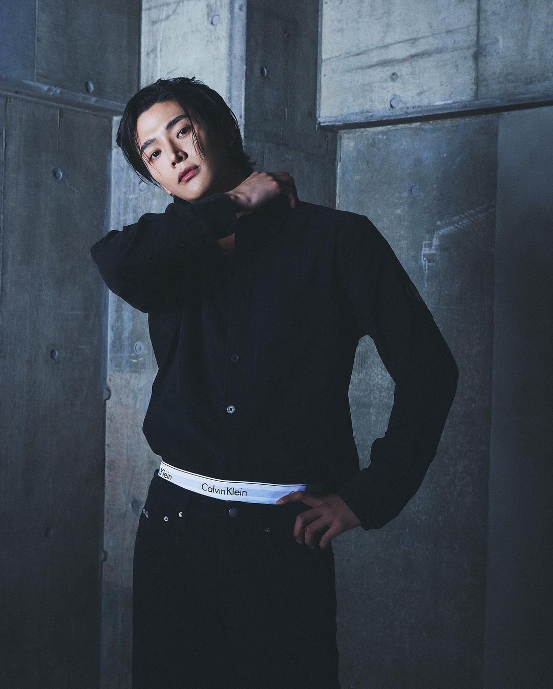 路雲的這套襯衫造型更是大膽前衛,Calvin Klein黑色襯衫配搭同色系直筒褲呈現率性休閒的風格,喜歡嘗試新風格的他還大膽露出Calvin Klein內褲邊緣,利用顏色巧妙勾勒完美身材比例,將大長腿優勢凸顯出來。