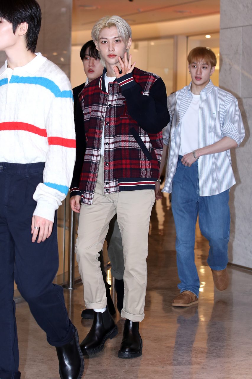 Felix與Stray Kids隊友亮相首爾現代百貨公司的Tommy Hilfiger新店開幕式現場時,他化身校園風男孩,紅黑色格紋棒球服配搭卡其色休閒褲,腳上穿著黑色切爾西短靴,整體造型一展獨自屬於Felix的青春陽光活力。