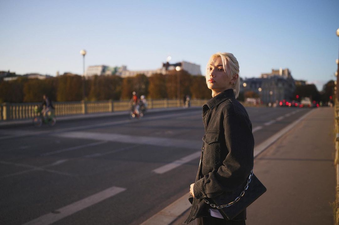 在巴黎看時裝騷期間,Felix定格街頭風采,身穿水洗灰色背心,頭戴Louis Vuitton黑色針織帽,冷帽的品牌標識與垂墜在頸間的長項鍊相映成趣,以簡潔配色構築潮流姿態。
