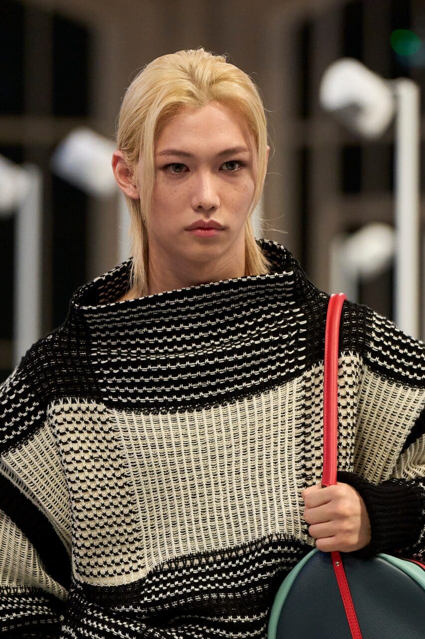 再度以模特兒身分登上天橋的Felix,以黑白條紋上衣搭配大地色系格紋褲裝,呈現一種帶有復古氣息的造型。這組搭配在剪裁與配色 上極具層次感,條紋與格紋的碰撞巧妙地展現不對稱美學,打破傳統搭配的界限。整體造型再配上一款拼色旅行袋,在低調之中增添了視覺亮點,將Louis Vuitton奢華與實用並存的設計理念具象化。