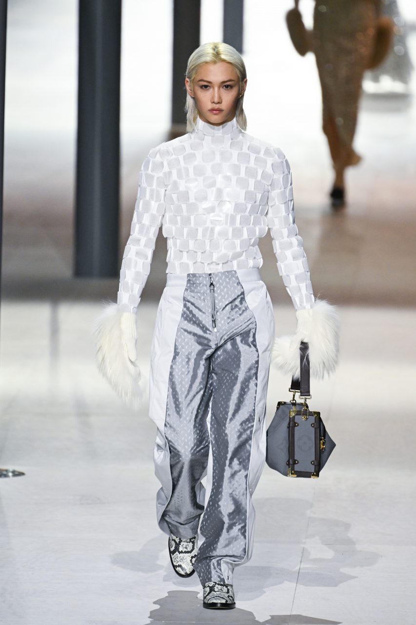紀念Nicolas Ghesquière與品牌合作十年傳奇旅程,Felix作為特別嘉賓參與走秀,他在時裝展上穿著白色鱗片上衣,貼身設計流露典雅格調,搭配羽毛白色手套詮釋時裝飄逸美學,灰白色西裝褲上覆蓋Louis Vuitton經典Monogram散發著精緻的魅力,與灰藍色Side Trunk手袋相得益彰,穿著蟒蛇紋皮靴呈現夢幻般的細膩質感。Felix還以標誌性白金色中長髮與造型進行呼應,配合淡雅的妝容,靈動而透亮,彷彿精靈走進了現實。