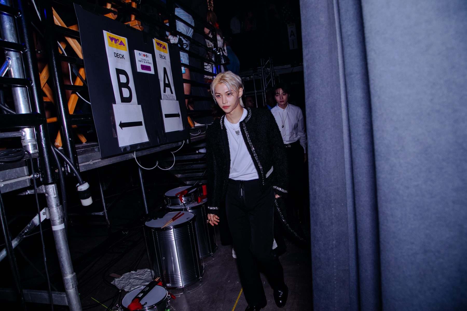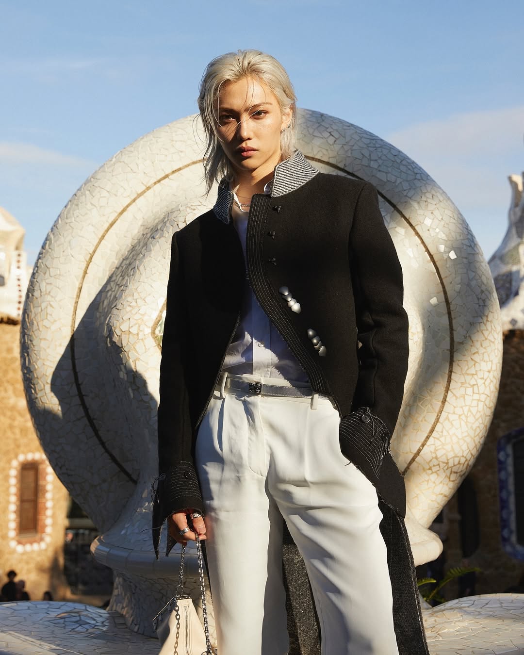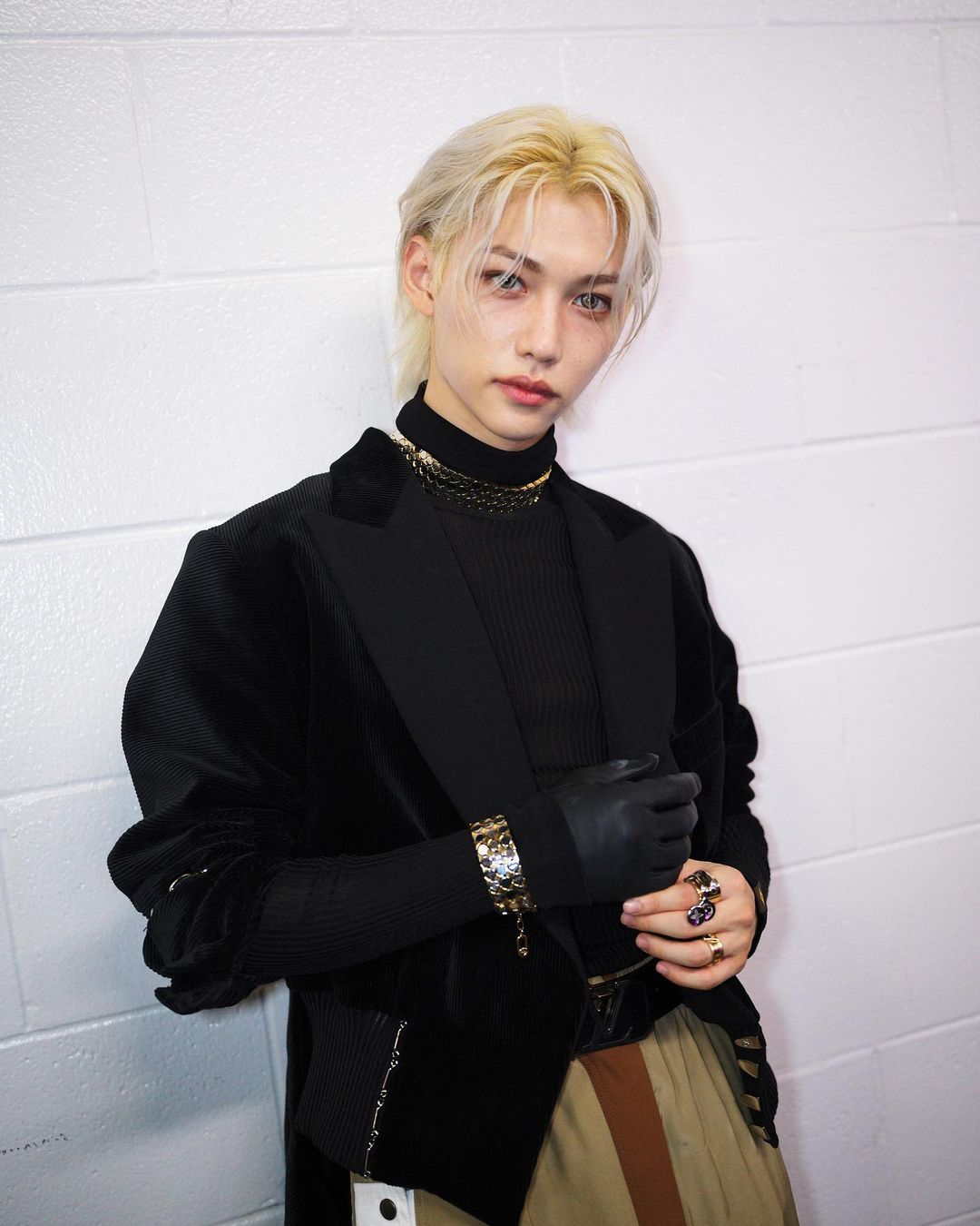 在2023 MTV Video Music Awards的另一套舞台穿搭中,Felix則上身由Louis Vuitton女裝設計總監Nicolas Ghesquière設計的服裝,他將服飾明顯的性別特徵消除,高領螺紋針織上衣,緞面修身西裝,配合一頭金髮,宛若一位霸氣冷冽的貴公子。