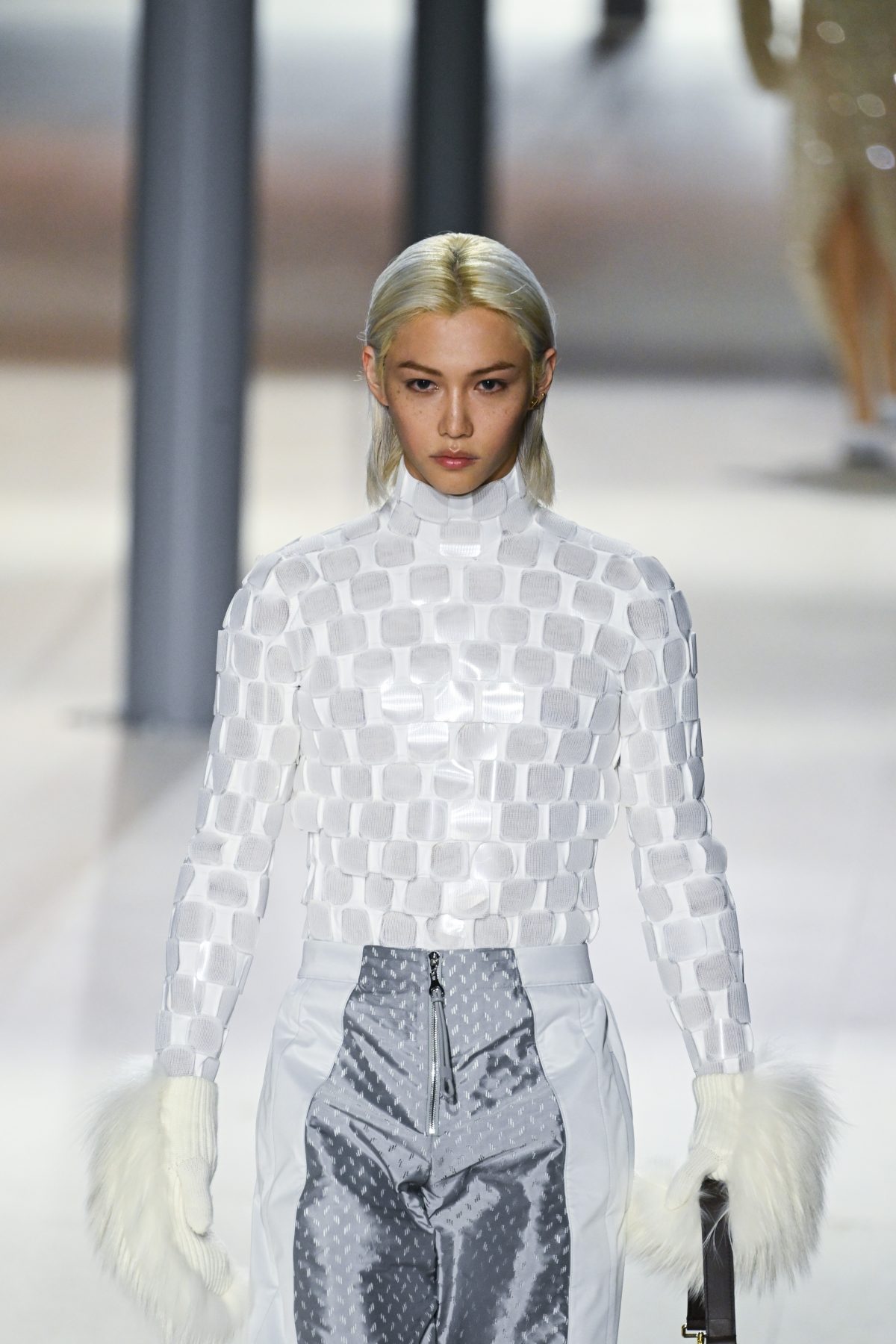 紀念Nicolas Ghesquière與品牌合作十年傳奇旅程,Felix作為特別嘉賓參與走秀,他在時裝展上穿著白色鱗片上衣,貼身設計流露典雅格調,搭配羽毛白色手套詮釋時裝飄逸美學,灰白色西裝褲上覆蓋Louis Vuitton經典Monogram散發著精緻的魅力,與灰藍色Side Trunk手袋相得益彰,穿著蟒蛇紋皮靴呈現夢幻般的細膩質感。Felix還以標誌性白金色中長髮與造型進行呼應,配合淡雅的妝容,靈動而透亮,彷彿精靈走進了現實。