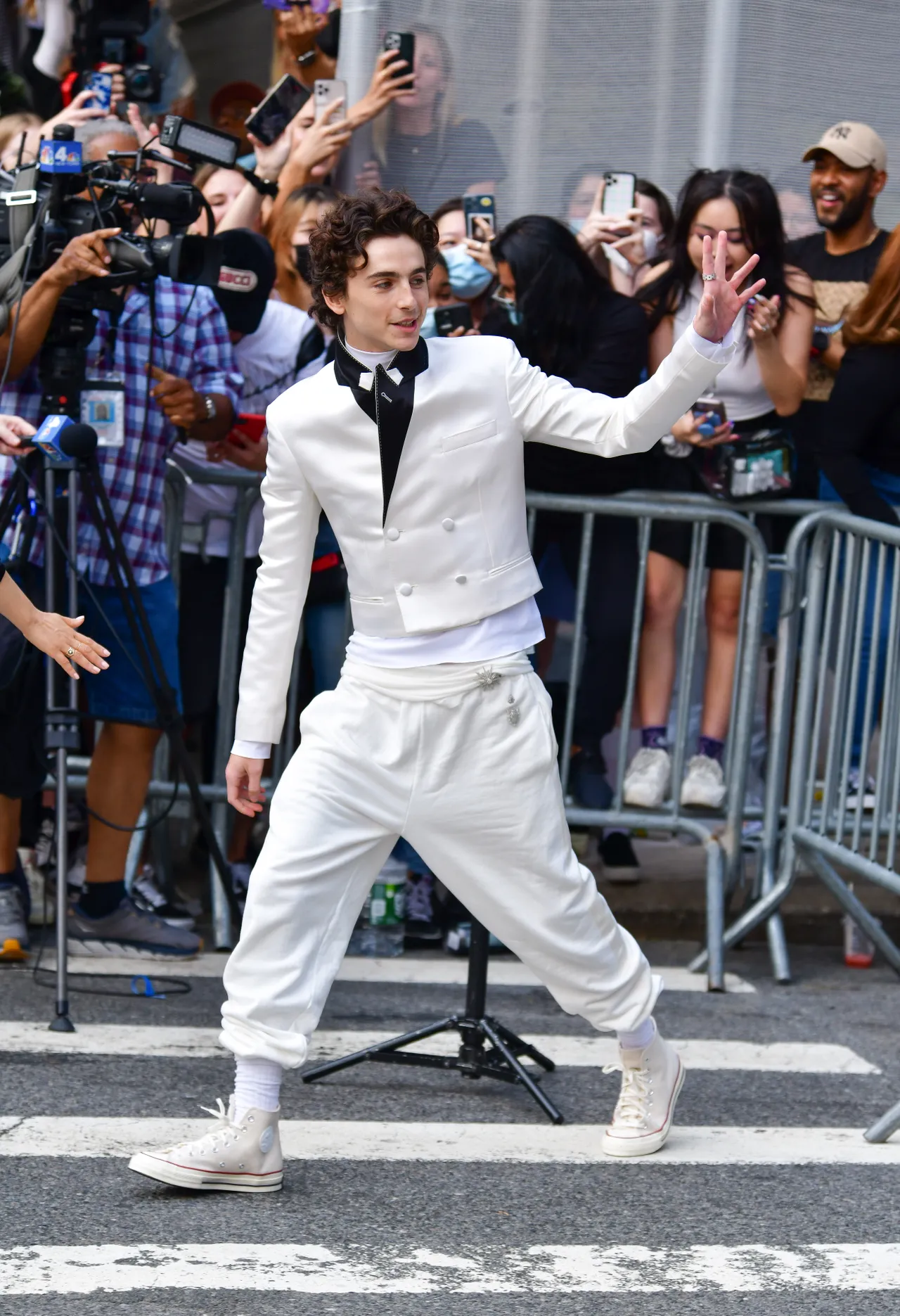 也許我們看不到其他名人穿得像 Chalamet 的原因,是因為他實際上正在展示一種獨有的風格;也許他厭倦了每次穿合身的服裝而引起的互聯網討論。畢竟,halamet 找到了一種穿得盡可能規律的自由感。他的反正規風格幾乎是令人嚮往的 —— 就像一個普通人一踏出門後就融入整個環境的風格。又如他出席大型場合的時候,穿著 Chuck Taylors 運動鞋配搭乳白色的 Haider Ackermann 晚禮服出現在 2021 年的 Met Gala 時,這無疑是令人感到放鬆; Chalamet 稱這是對 Taylors 先生的敬意,但同時讓人感覺像是對 90 年代真誠精神的回歸,當時的名人服裝都體現一種舒適和酷炫融合的時尚風格。