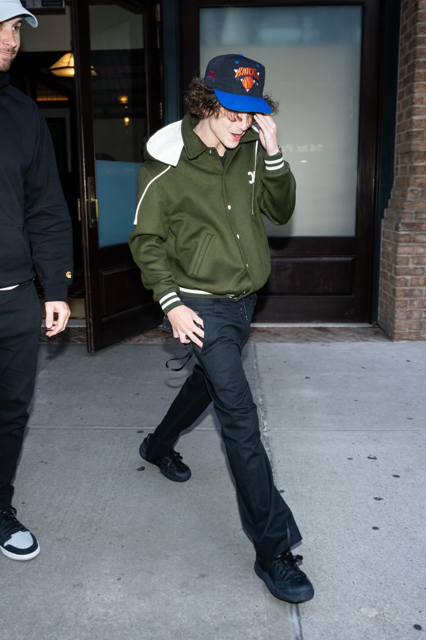 Timothée 一如既往地貫徹他的街頭大學生風格,將身上綠色的 Celine 棒球外套搭配黑色直筒褲與黑色球鞋,其中最顯眼的必然是他頭上的那頂紐約 Knicks 籃球隊的帽子,帶出這位男演員獨有的隨性風格。他的這類打扮符合現時大多數人在疫情後的打扮:隨性、自在、舒適。不過,筆者會形容 Timothée 已經踏進後現代 Swag 時尚風格。