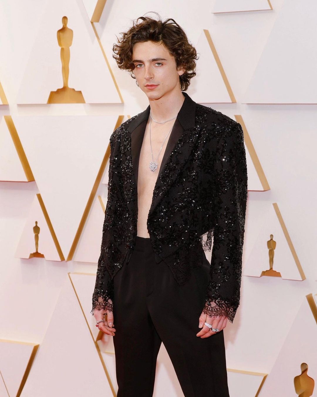 他在奧斯卡 2022 年頒獎典禮穿上 Louis Vuitton,由女裝設計師 Nicolas Ghesquière 設計的亮片短版女裝外套,並以真空打扮,可說是讓人印象深刻。有趣的是,明明 Nicolas Ghesquière 為眾多 IT girls 設計出相當 cool 的服裝, Chalamet 則展示出另一種時尚美態,顯然這位年輕小伙子對時尚的觸覺令大家所佩服。