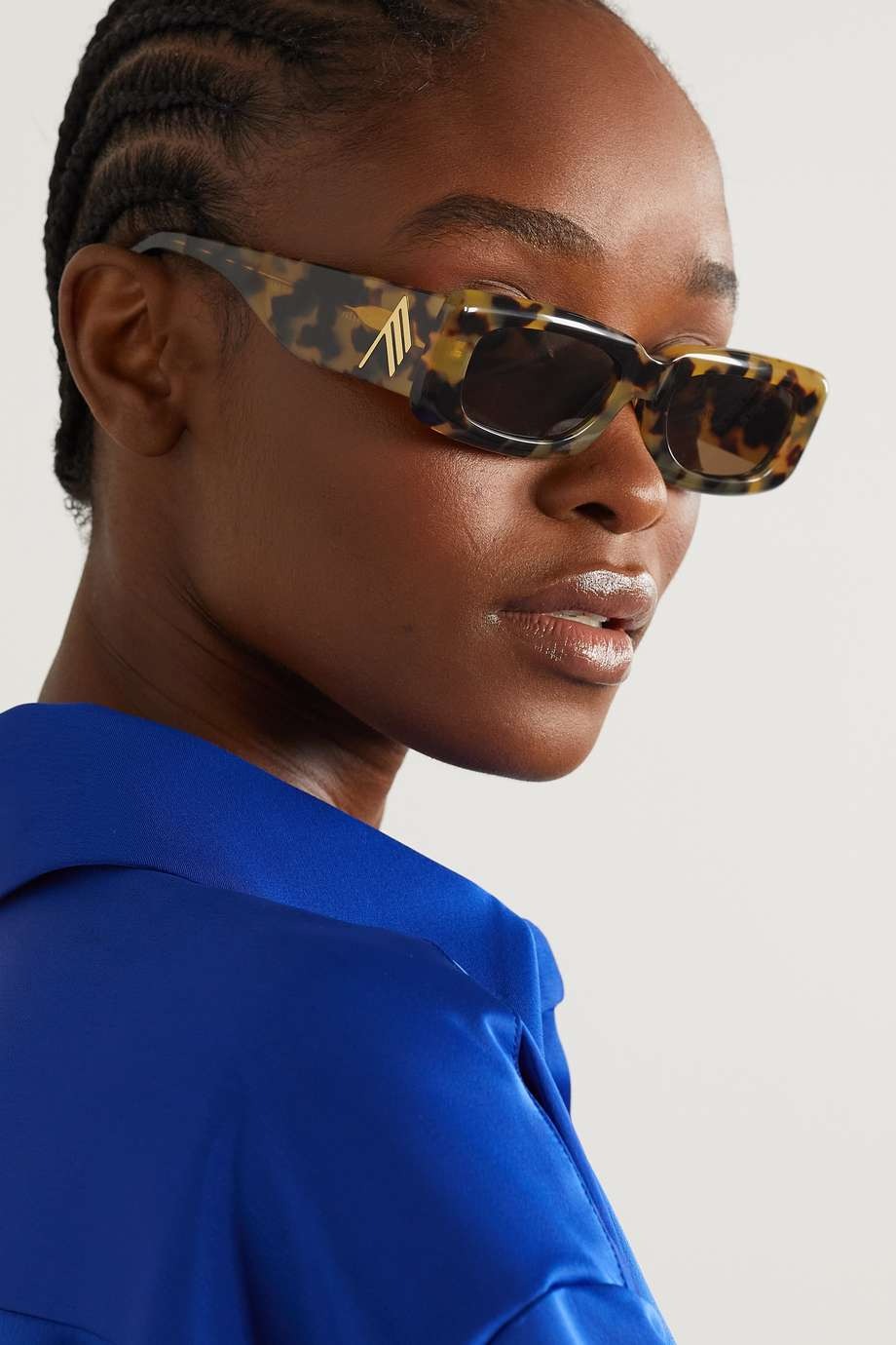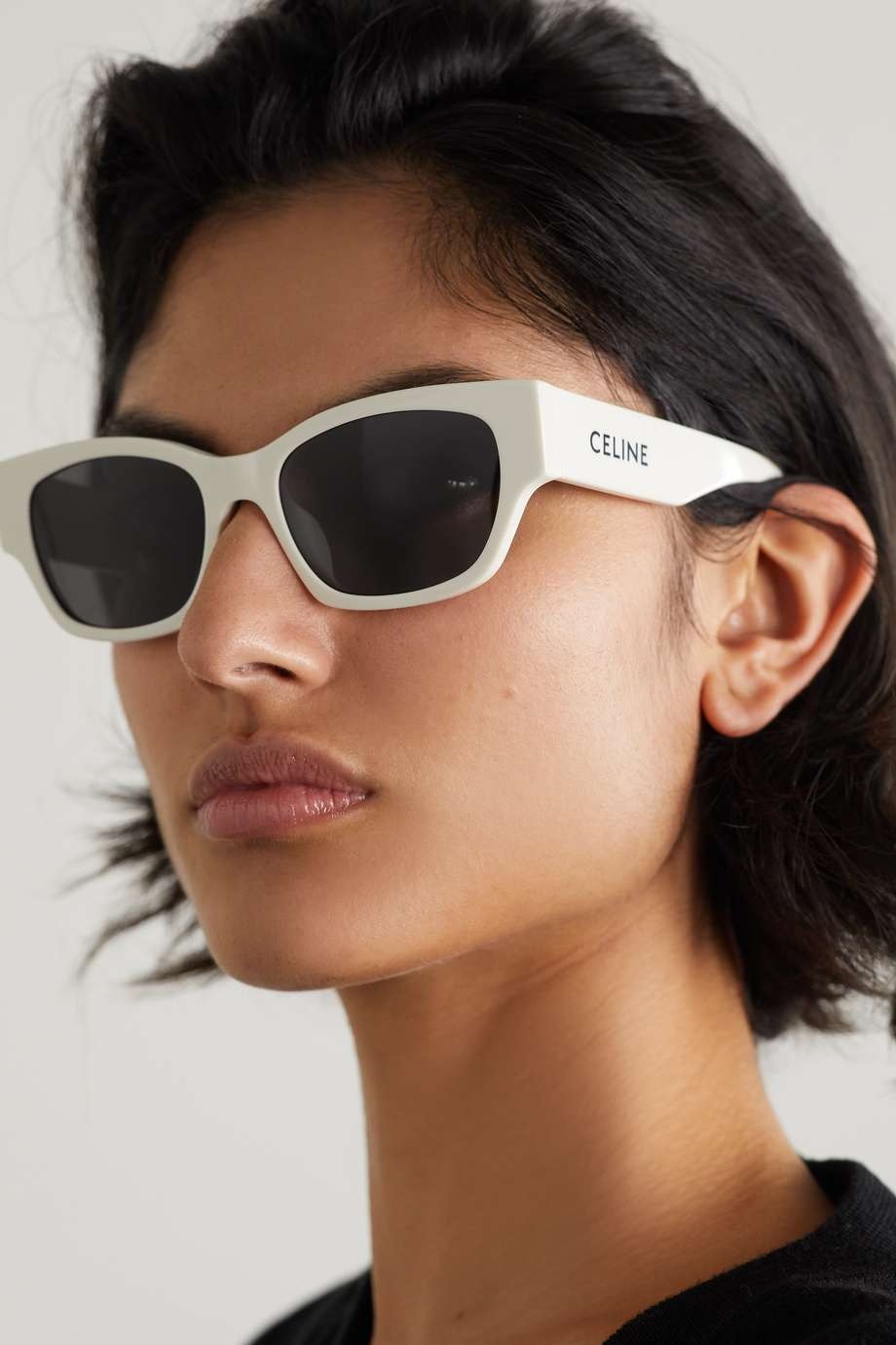 頂部兩角尖銳的貓眼眼鏡將額頭拉寬,以顯得突出的顴骨相對不那麼明顯,讓臉部線條更流暢。