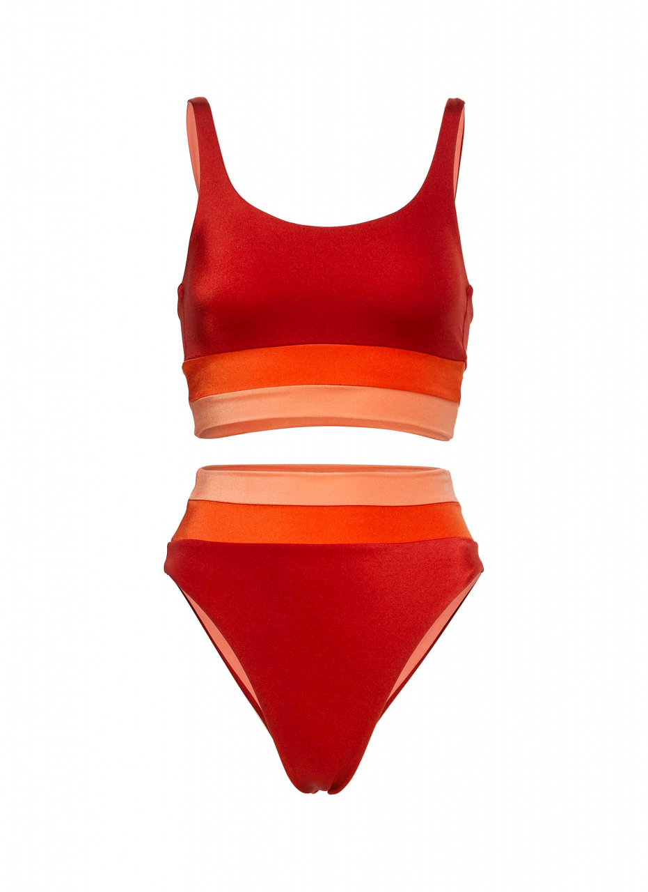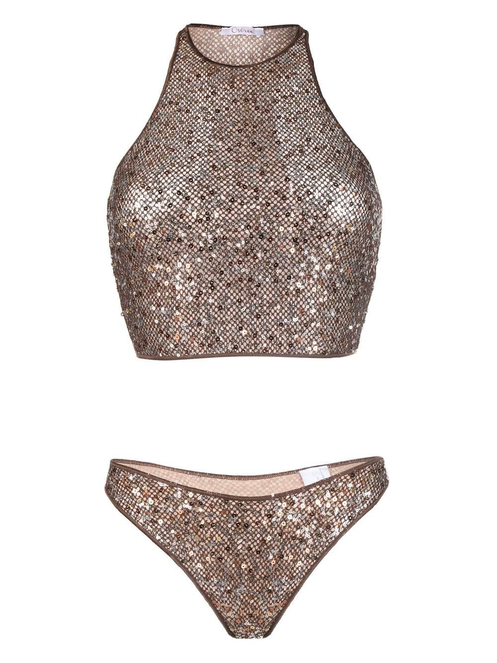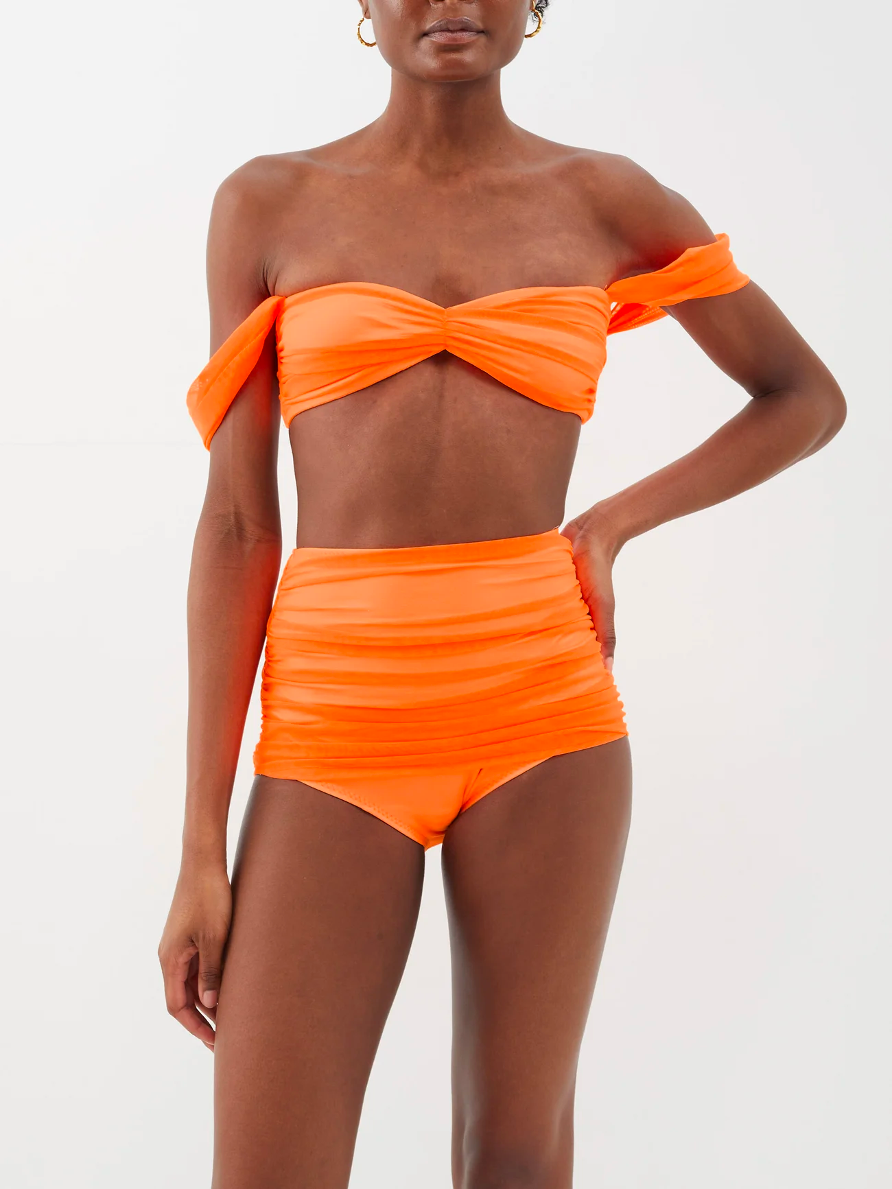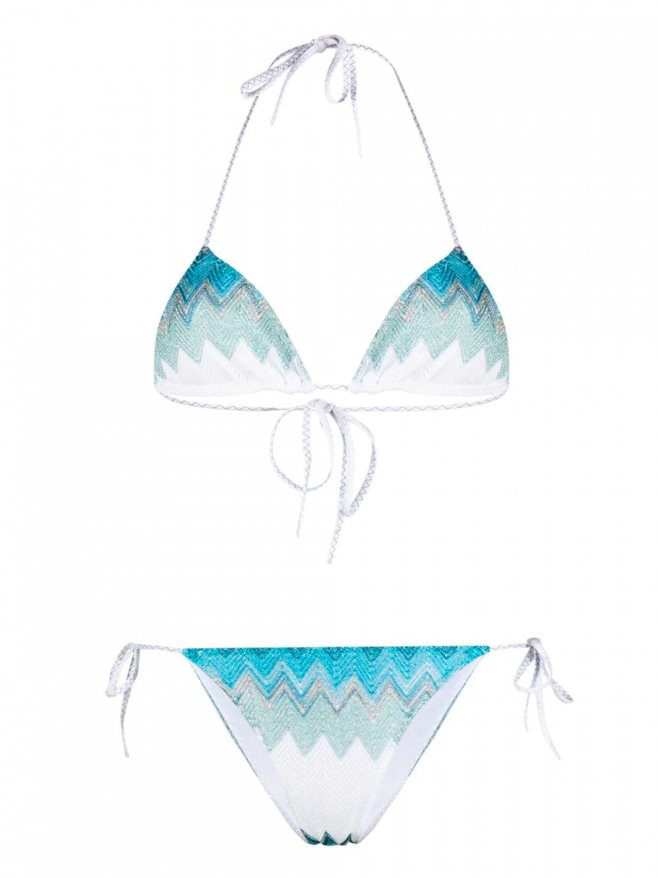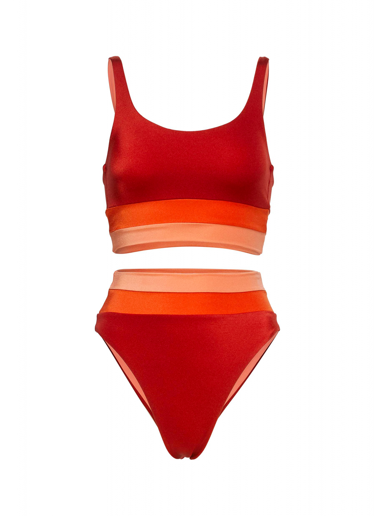 同樣參照復古風格的還有兩截式泳衣,高腰剪裁搭配溫暖色系,讓女士回歸七、八十年代的優雅美學。喜歡獨特細節者,亦可選擇平肩設計比堅尼,修飾手臂線條同時展露迷人的肩胛骨線條。