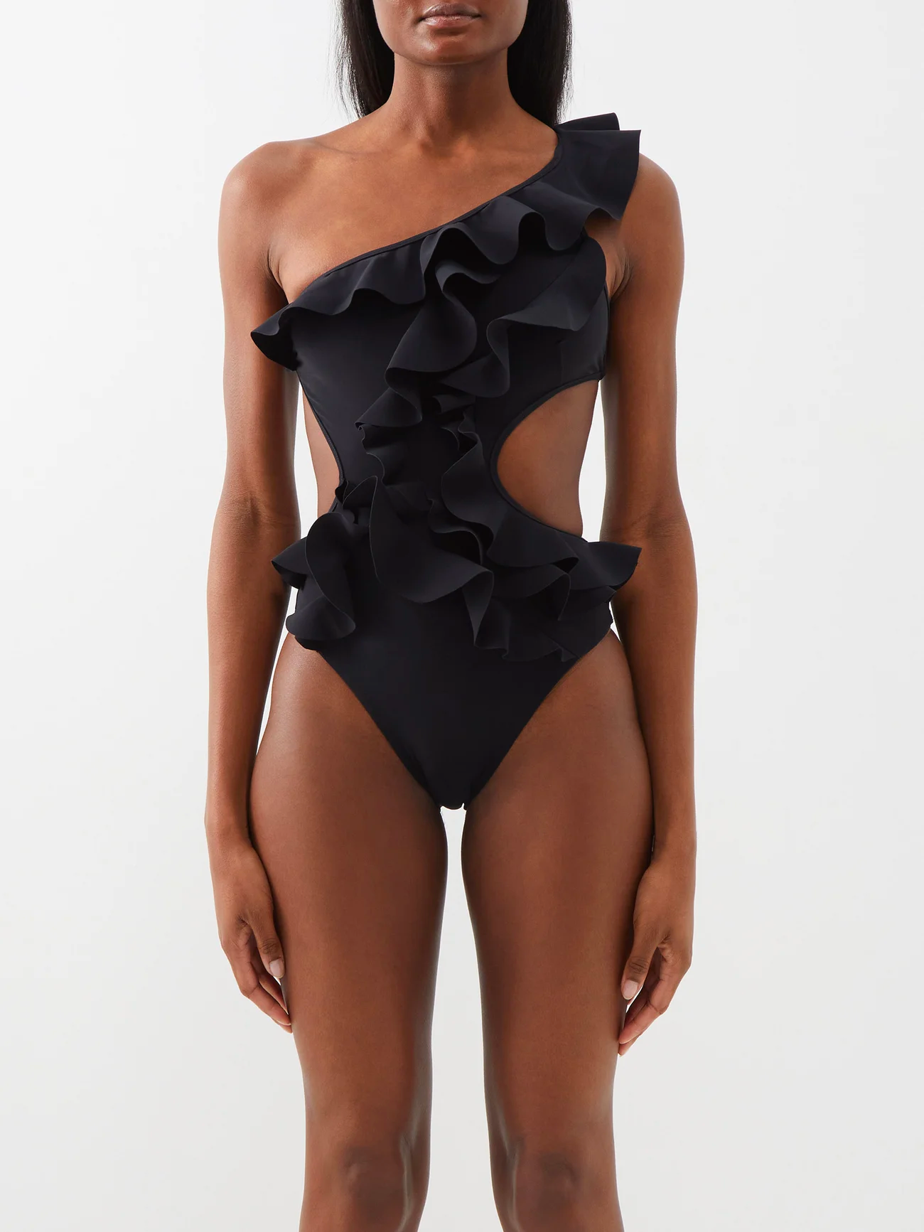 荷葉邊綴飾於泳衣上並非今年獨有,但今個春夏浪漫主義復興,則讓這種設計再度回歸。荷葉邊細節能增添女性化氣質,同時為女性修飾身材,一舉兩得。