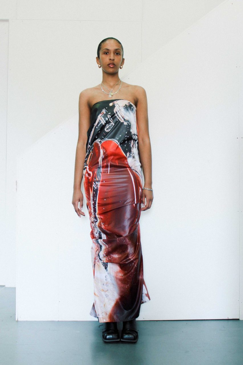 Hakin 的創新作品狂野、感性且多才多藝。設計範圍從帶有引人注目的不對稱緊身連衣裙,上面有着抽象的車禍圖像,以及低至臀部的切片長褲,還有那印有一次性圖案的 wet-look Lycra 泳裝。