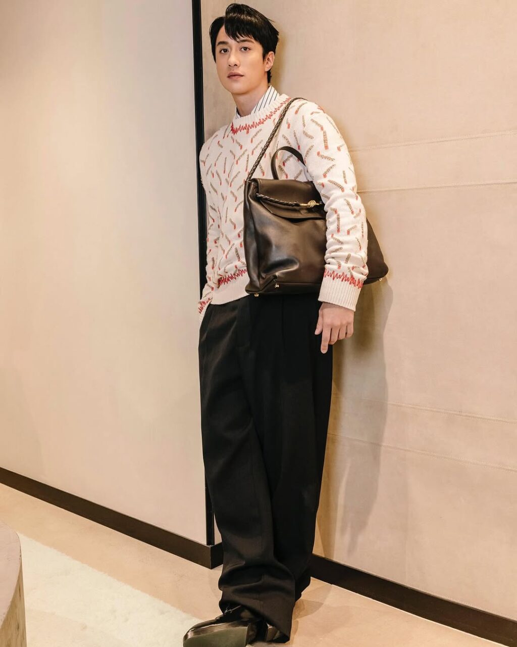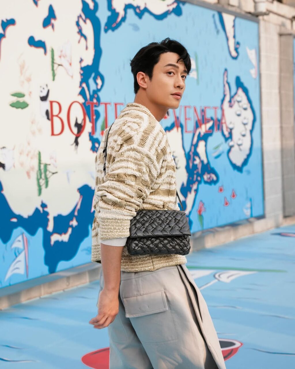 除了西裝造型,劉俊謙偶爾會穿上花俏的毛衣出席Bottega Veneta的時尚活動,不過搭配簡約設計的長褲和精緻的編織手袋後,為整體造型帶來和諧與溫暖的視覺效果。