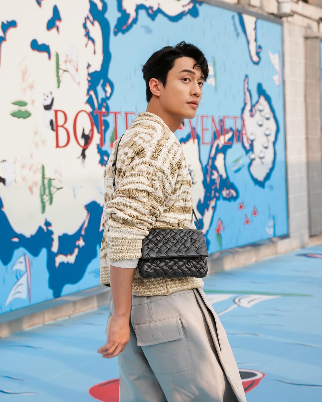 除了西裝造型,劉俊謙偶爾會穿上花俏的毛衣出席Bottega Veneta的時尚活動,不過搭配簡約設計的長褲和精緻的編織手袋後,為整體造型帶來和諧與溫暖的視覺效果。