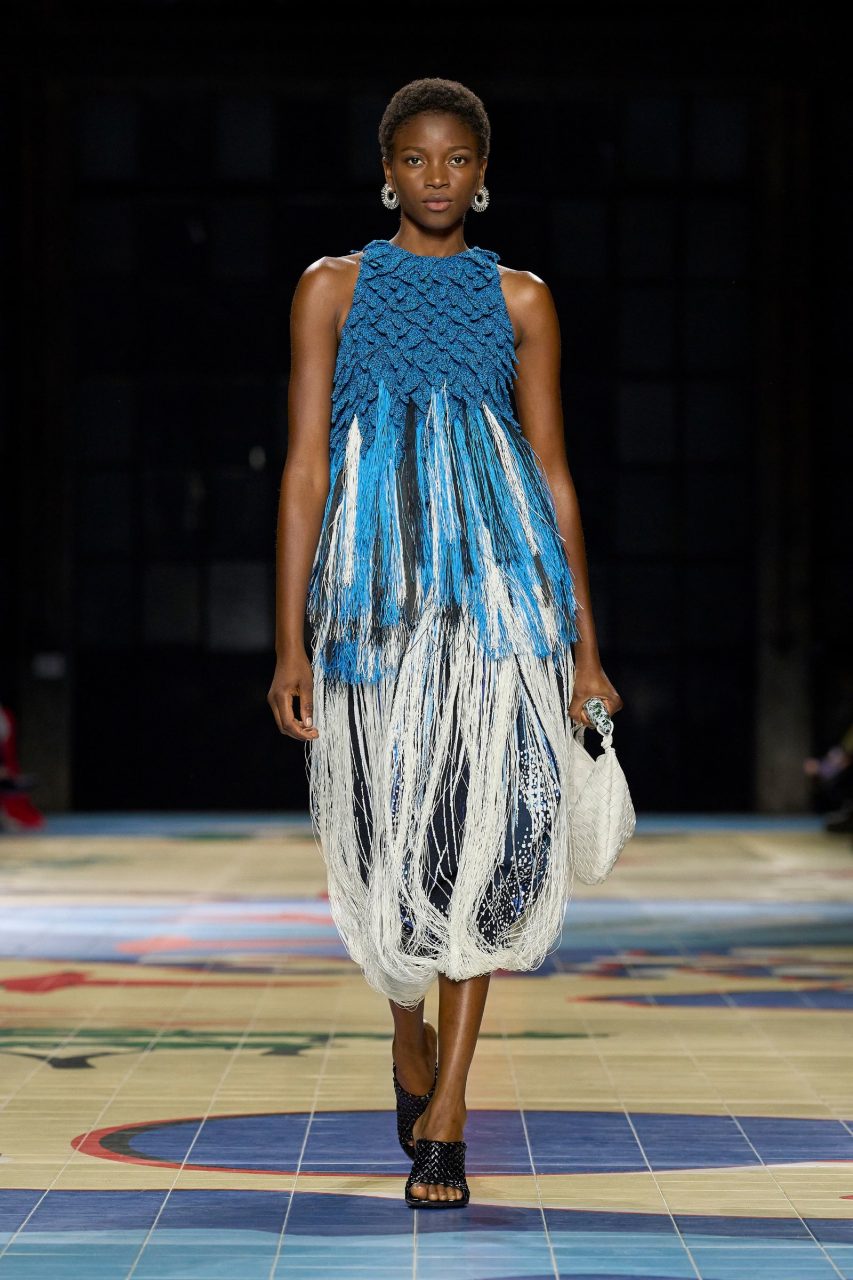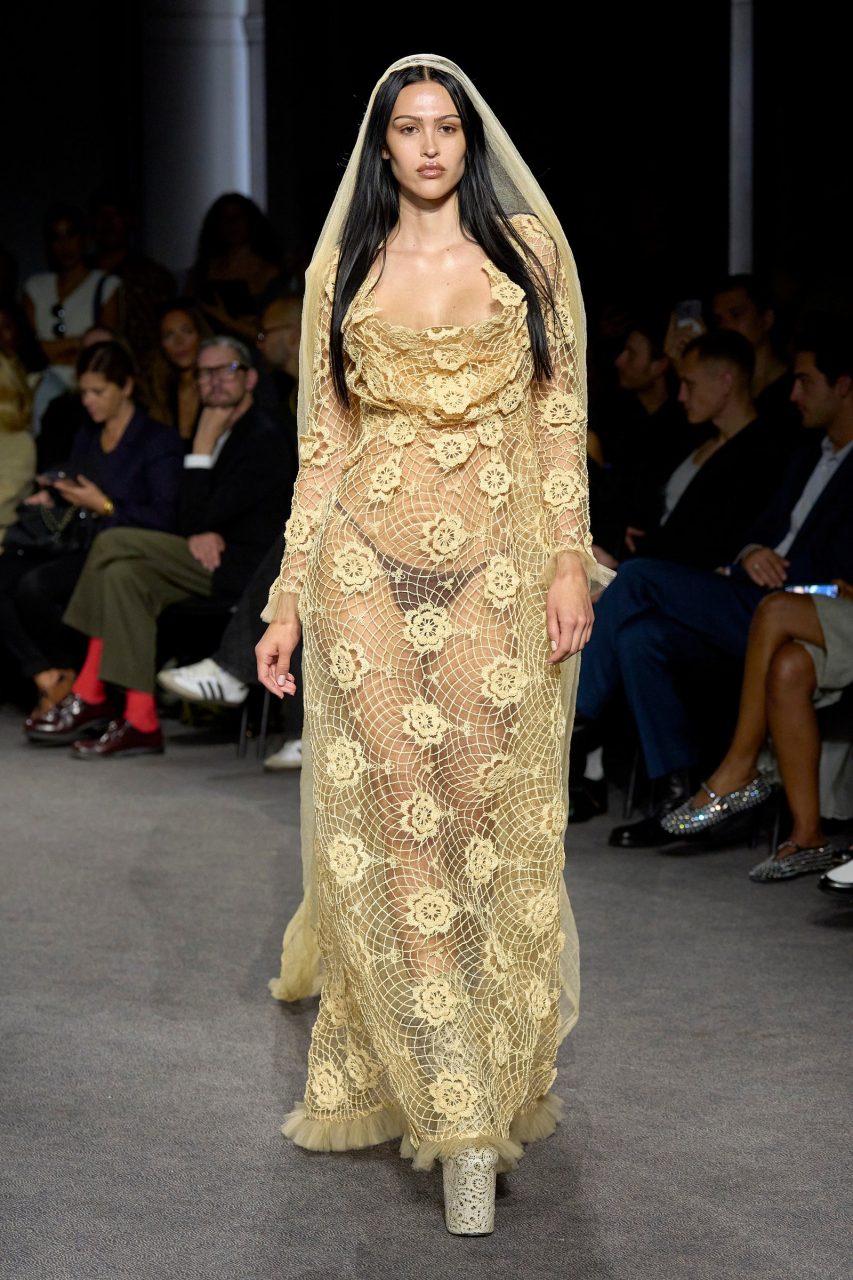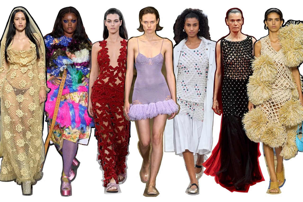 Matthieu Blazy在Bottega Veneta的巧妙手法得到了延續,他從仿牛仔布的皮革款式轉向了點綴著絨球的網紗禮服和看起來像由羽毛製成的流蘇禮服,它們實際上是用皮革製成的。這種巧妙的構思在Diesel上繼續延續,Glenn Martens將廢棄的牛仔布和針織布製成具有剝落效果的派對禮服,並將舊電影海報融化成外套。此外,其他品牌也採用鉤針編織、激光切割皮革等工藝,為手工藝帶來升級創新。