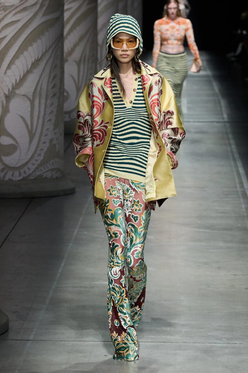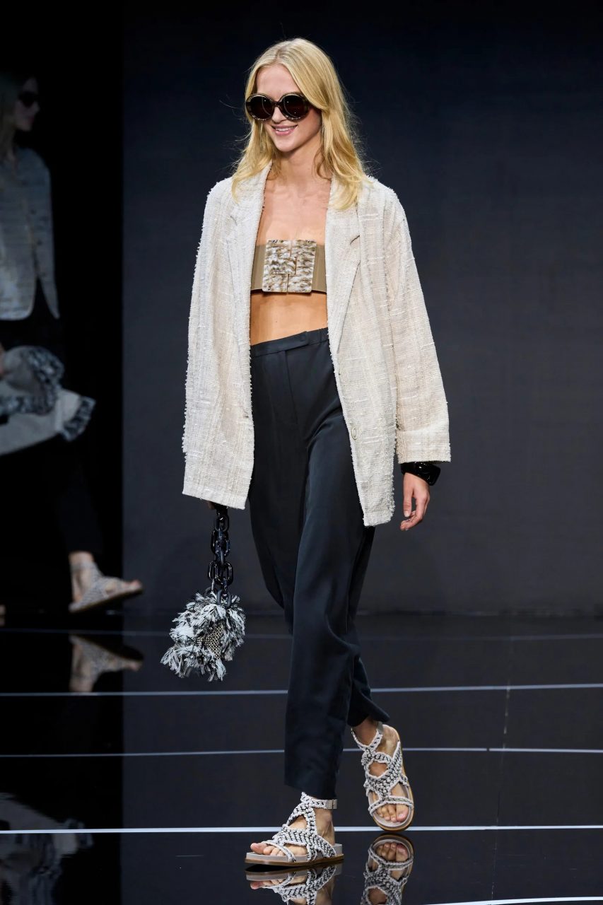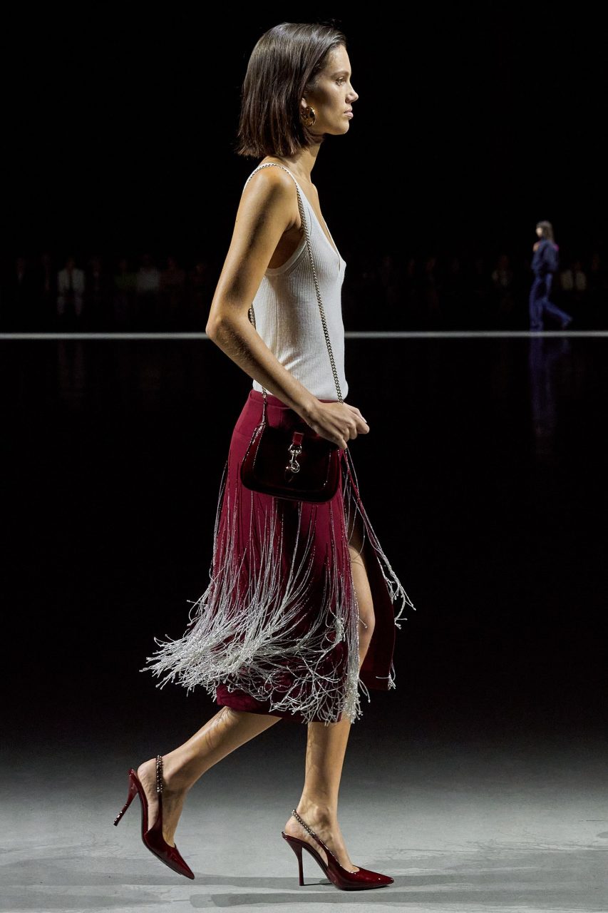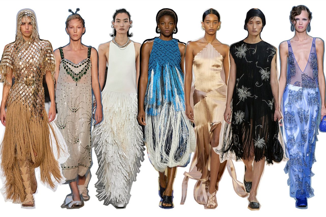 Prada 的春季時裝秀上點綴著水晶輪、金屬流蘇和閃亮的扣環,將雕塑式的裁剪和流行的裙裝搭配融合在一起,展現出爵士時代的活力。這場引人注目的時裝展為《Vogue》編輯們所稱的「The Modern Flapper」趨勢揭開了序幕。在本季時裝騷中,鍍金流蘇、閃亮頭飾和收腰連衣裙讓我們聯想到20世紀20年代的娃娃裝,而2024年,這些元素又與皮革外套和西裝外套進行混搭。