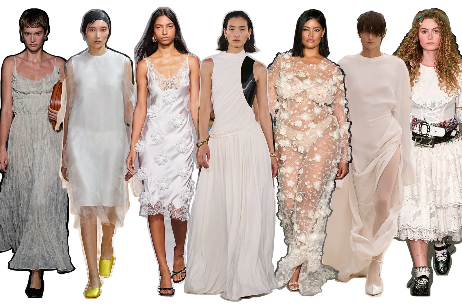 從薄如蟬翼和半透明的款式到繡花和密集工藝的款式,設計師們明確表示他們轉向了一系列白色連身裙,從每年春季都會出現的繽紛色彩和豔麗粉色中跳脫出來。