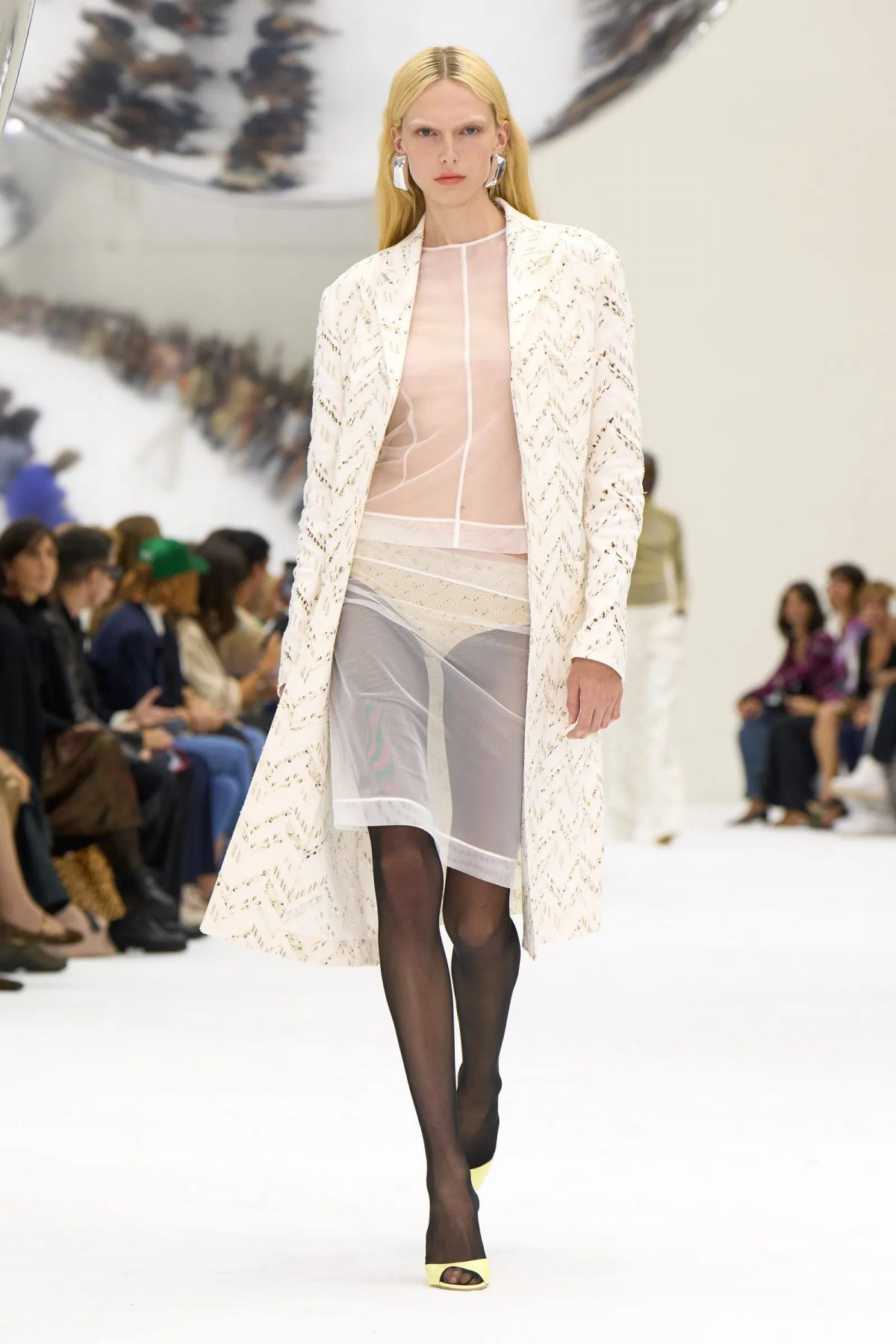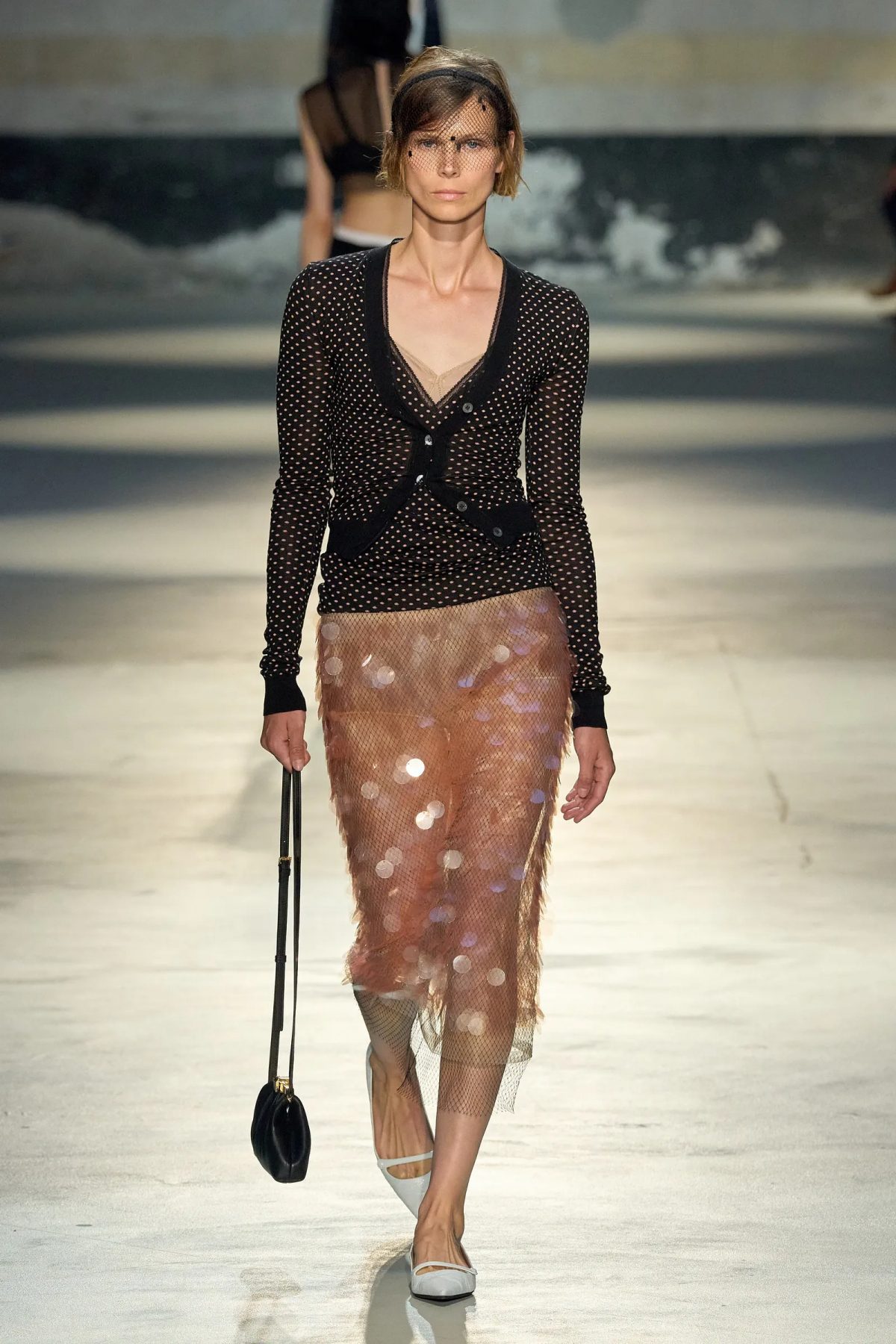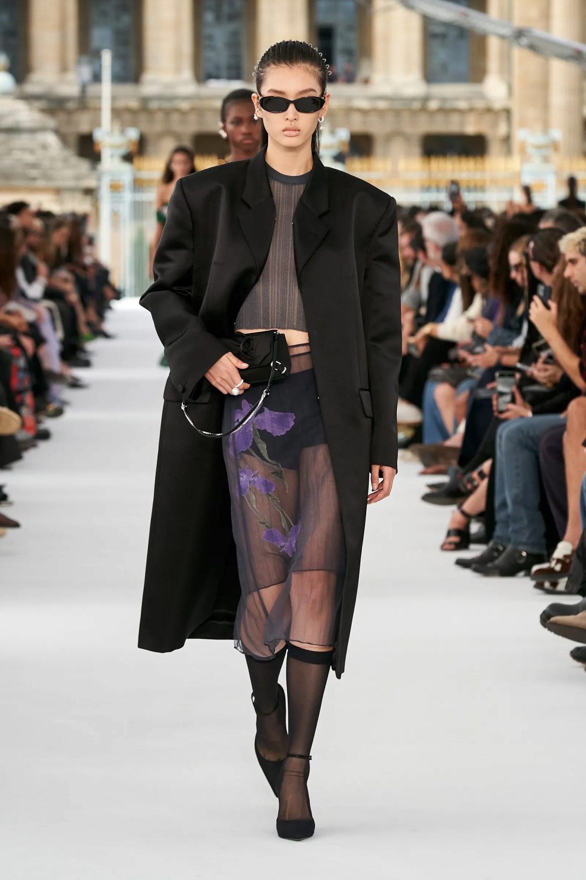 在經歷了幾季薄紗飄逸的禮服和以內衣為靈感的細節設計之後,透視裙成為春季的焦點,無論是白天還是夜晚,它都是值得嘗試的性感造型。Altuzarra將透視鉛筆裙與柔軟的圓領毛衣和手提包搭配在一起,展現出淑女風范,這種搭配在Carolina Herrera、Coperni、Givenchy和Carven等品牌中也有出現。如果你覺得這樣的搭配有點浮誇,那就像在Louis Vuitton時裝騷上看到的那樣,將薄紗層疊加倍,再搭配一件Bomber Jacket和粗款腰帶。