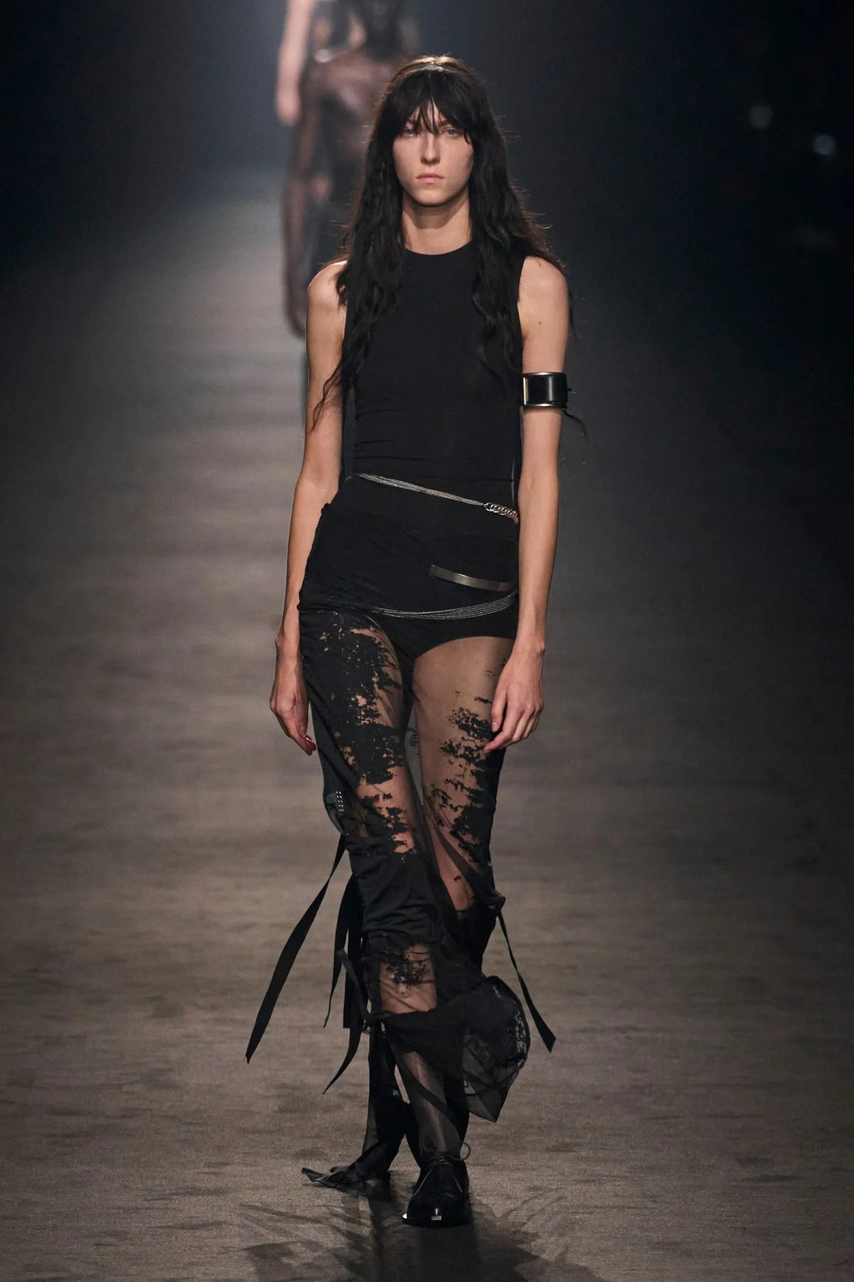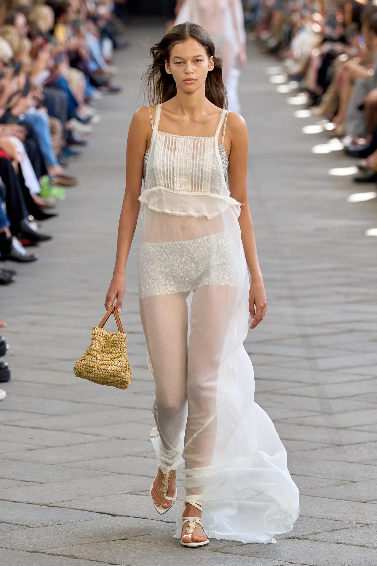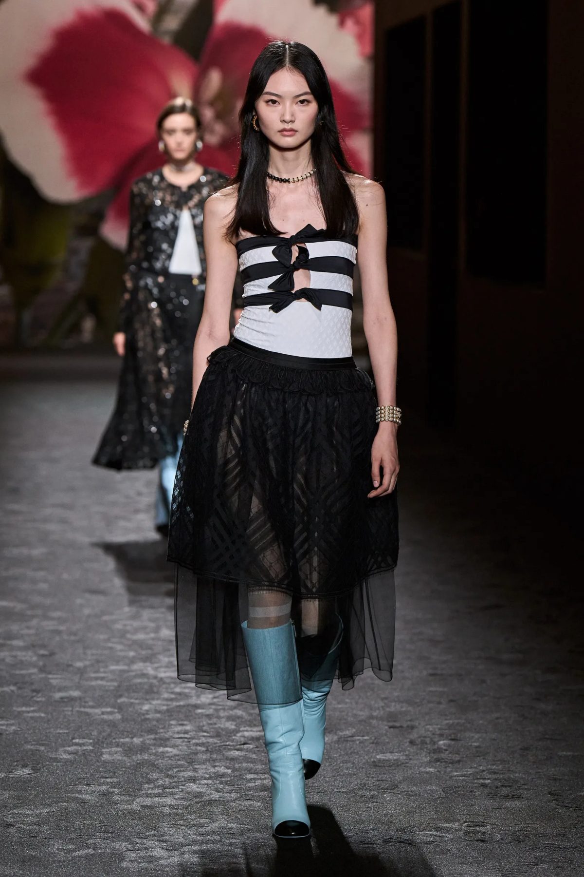 在經歷了幾季薄紗飄逸的禮服和以內衣為靈感的細節設計之後,透視裙成為春季的焦點,無論是白天還是夜晚,它都是值得嘗試的性感造型。Altuzarra將透視鉛筆裙與柔軟的圓領毛衣和手提包搭配在一起,展現出淑女風范,這種搭配在Carolina Herrera、Coperni、Givenchy和Carven等品牌中也有出現。如果你覺得這樣的搭配有點浮誇,那就像在Louis Vuitton時裝騷上看到的那樣,將薄紗層疊加倍,再搭配一件Bomber Jacket和粗款腰帶。