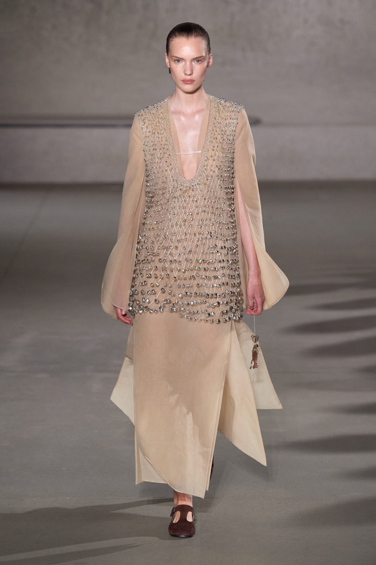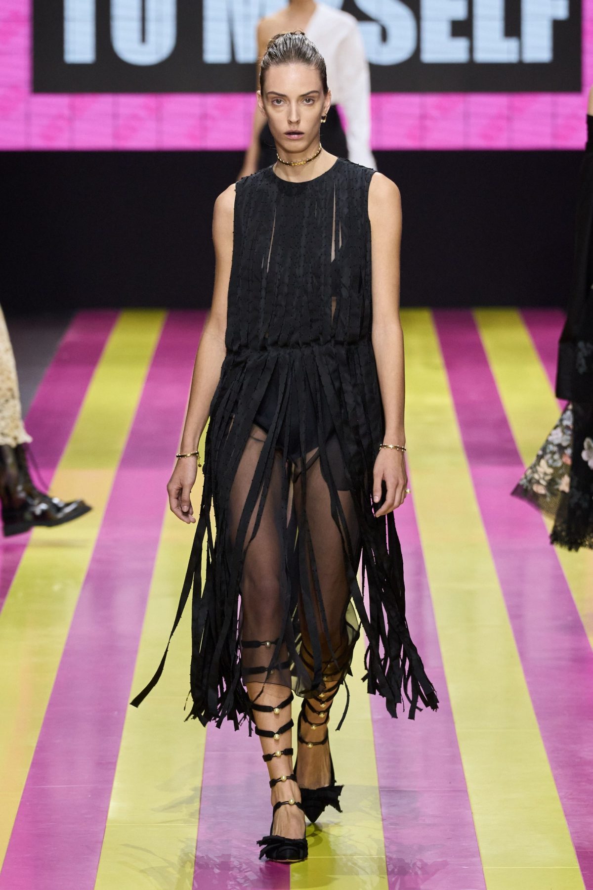 Prada 的春季時裝秀上點綴著水晶輪、金屬流蘇和閃亮的扣環,將雕塑式的裁剪和流行的裙裝搭配融合在一起,展現出爵士時代的活力。這場引人注目的時裝展為《Vogue》編輯們所稱的「The Modern Flapper」趨勢揭開了序幕。在本季時裝騷中,鍍金流蘇、閃亮頭飾和收腰連衣裙讓我們聯想到20世紀20年代的娃娃裝,而2024年,這些元素又與皮革外套和西裝外套進行混搭。