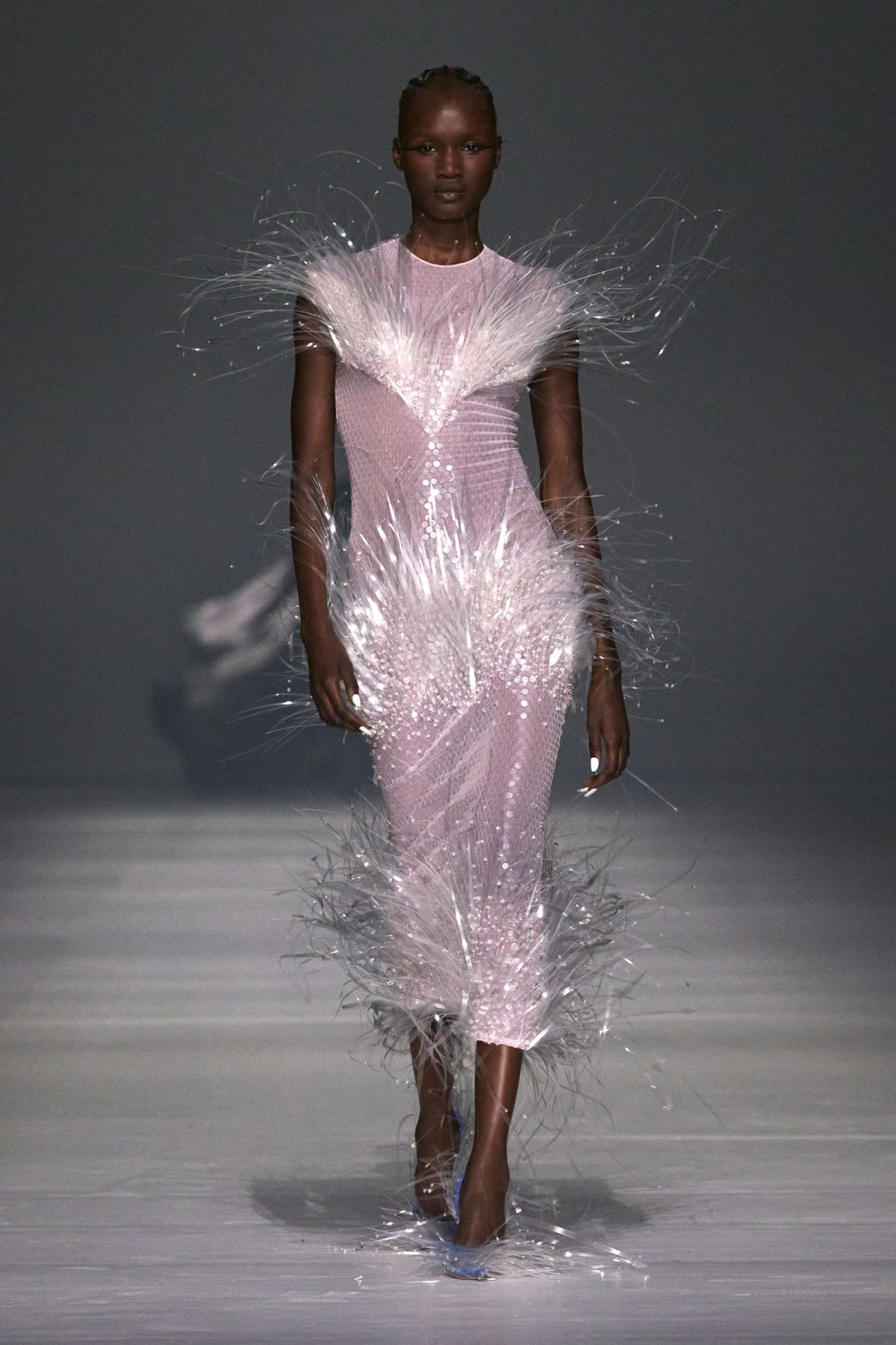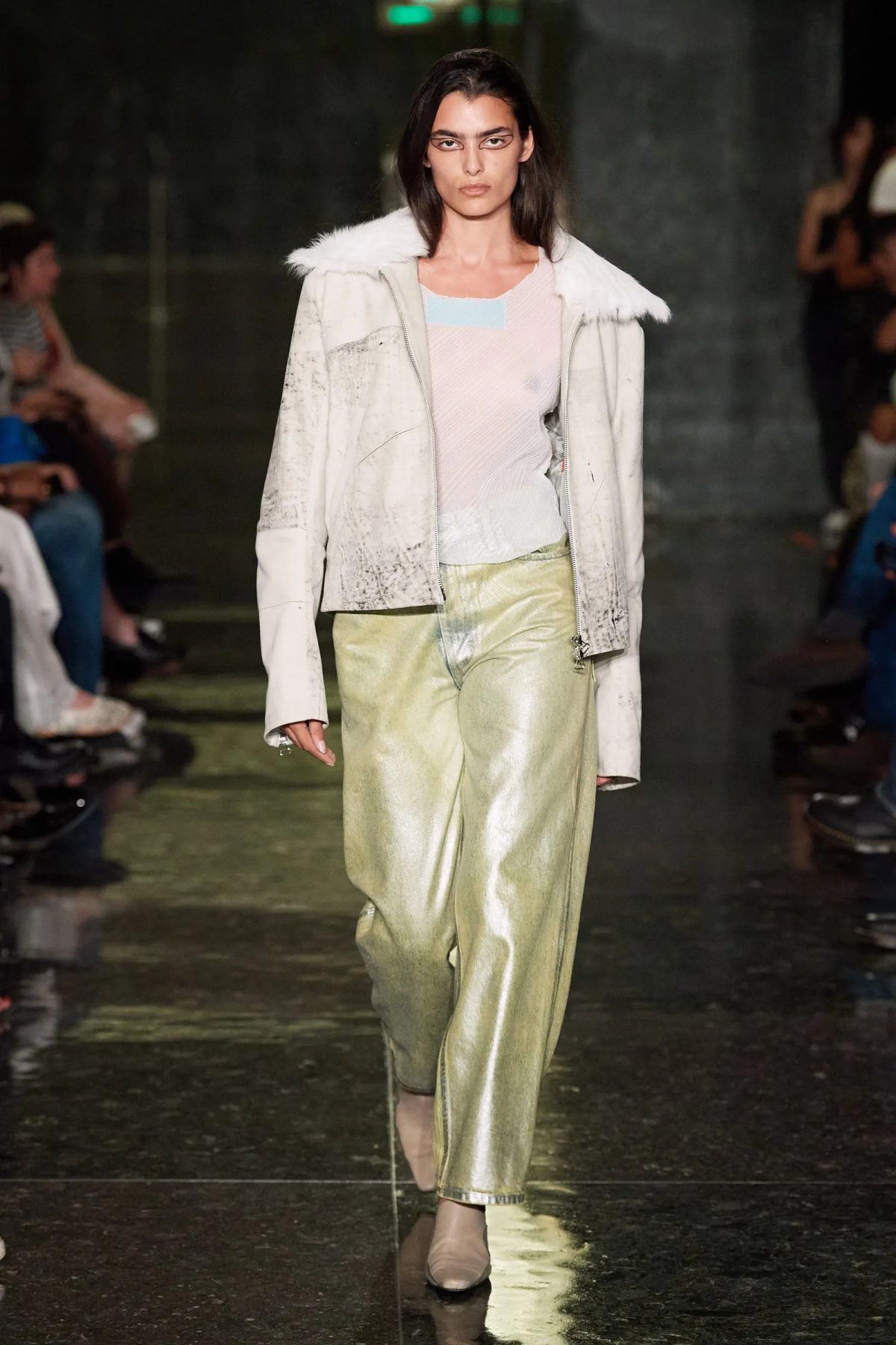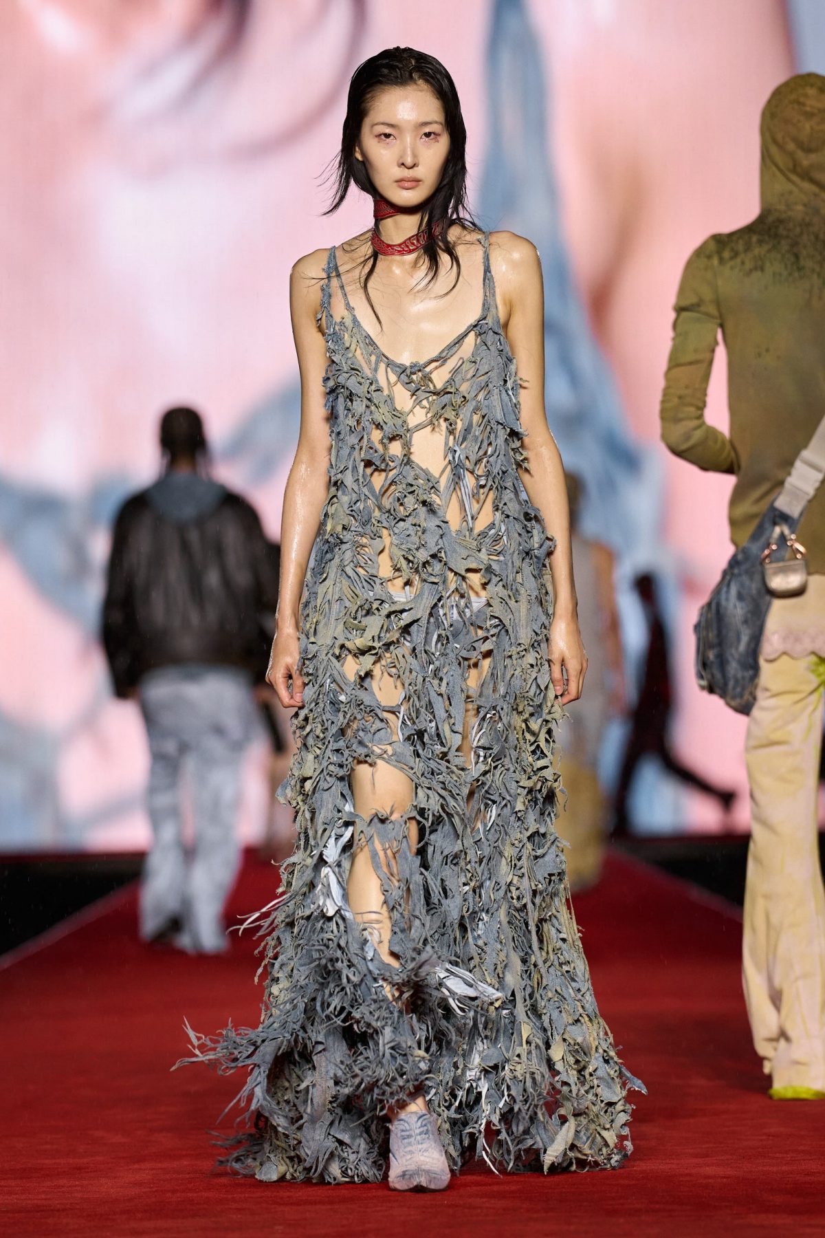 Matthieu Blazy在Bottega Veneta的巧妙手法得到了延續,他從仿牛仔布的皮革款式轉向了點綴著絨球的網紗禮服和看起來像由羽毛製成的流蘇禮服,它們實際上是用皮革製成的。這種巧妙的構思在Diesel上繼續延續,Glenn Martens將廢棄的牛仔布和針織布製成具有剝落效果的派對禮服,並將舊電影海報融化成外套。此外,其他品牌也採用鉤針編織、激光切割皮革等工藝,為手工藝帶來升級創新。