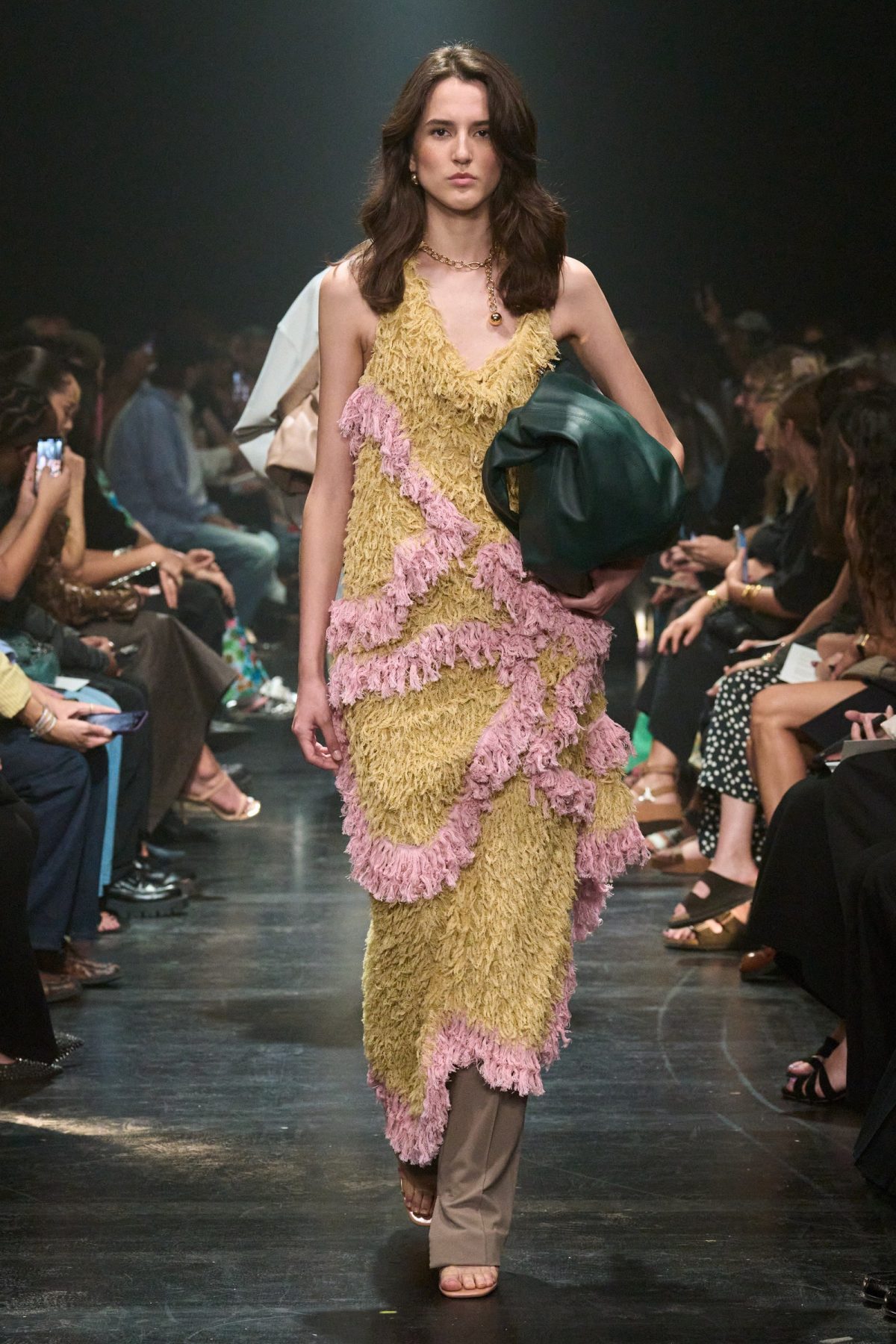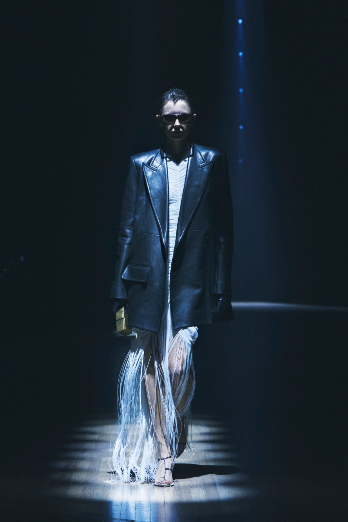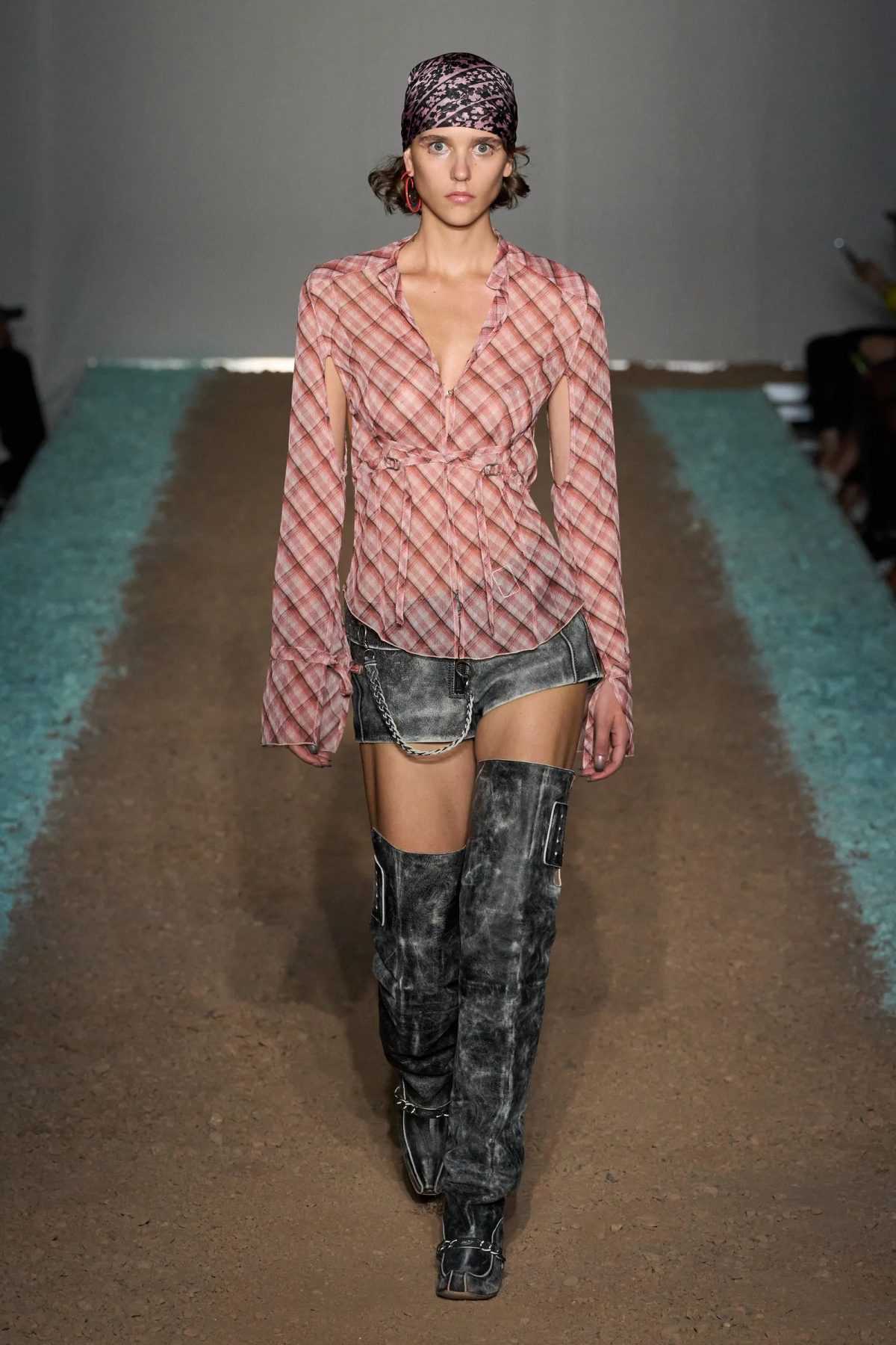 Matthieu Blazy在Bottega Veneta的巧妙手法得到了延續,他從仿牛仔布的皮革款式轉向了點綴著絨球的網紗禮服和看起來像由羽毛製成的流蘇禮服,它們實際上是用皮革製成的。這種巧妙的構思在Diesel上繼續延續,Glenn Martens將廢棄的牛仔布和針織布製成具有剝落效果的派對禮服,並將舊電影海報融化成外套。此外,其他品牌也採用鉤針編織、激光切割皮革等工藝,為手工藝帶來升級創新。