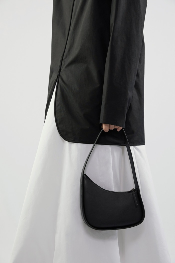 The Row 的 Half Moon 以 90 年代的時尚廓形為藍本,有着符合人體工程學的弧形設計,巧妙地貼合在肩部下方,而且絲毫沒有凸起。它非常寬敞,絨面革襯裡內襯與意大利皮革袋身形成鮮明對比,外層壓印著您可能見過的最小的品牌印記,你可能眨眼就會錯過它——但,這就是重點。