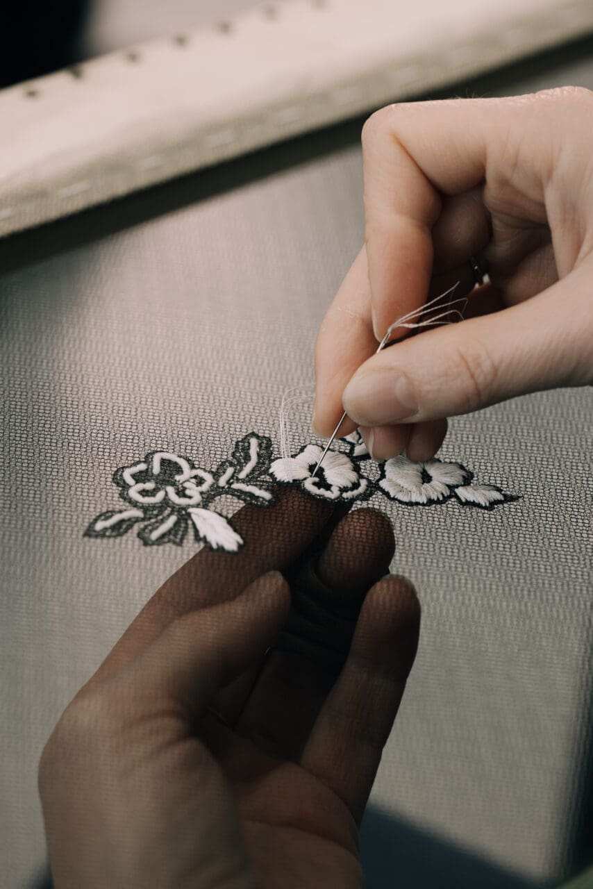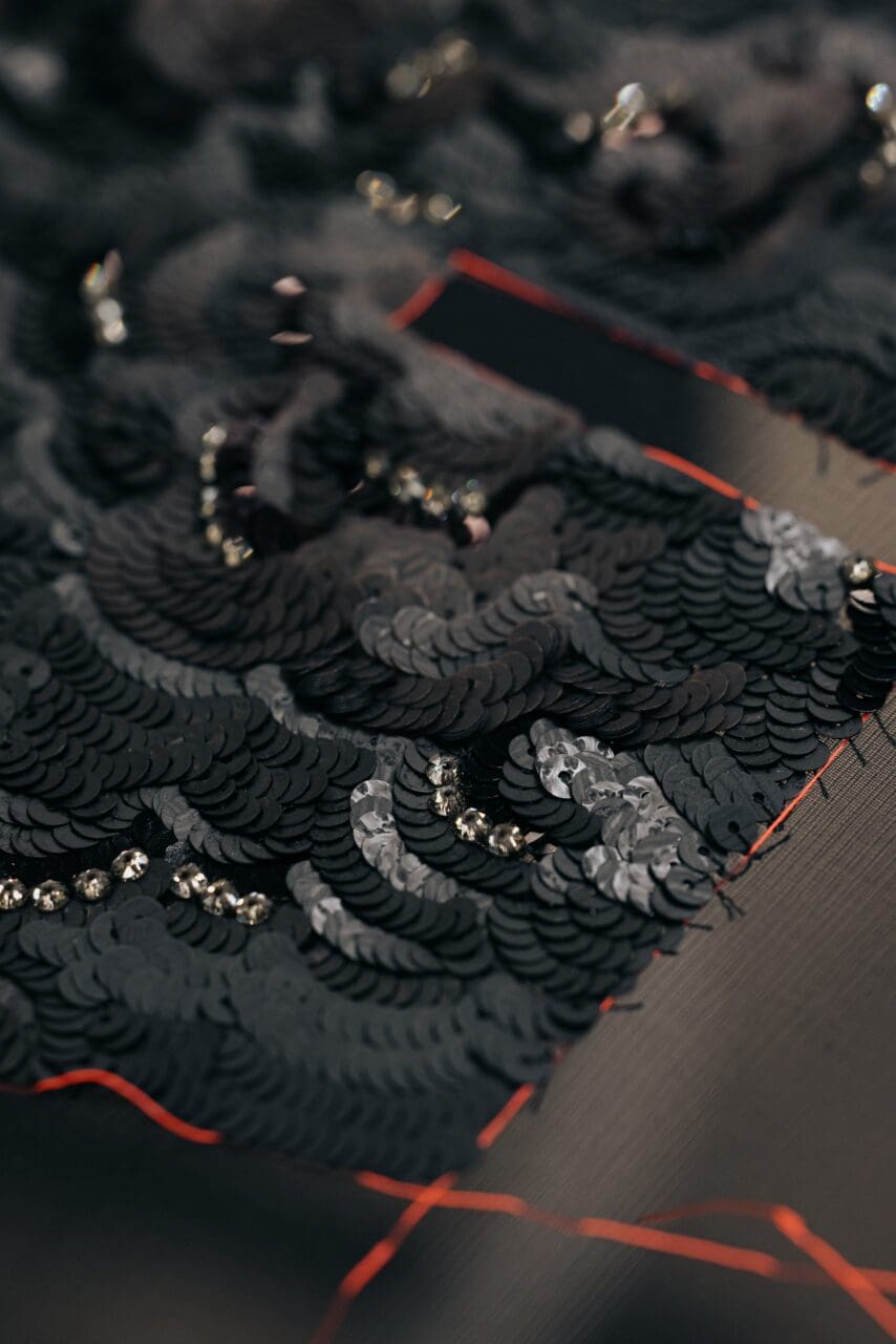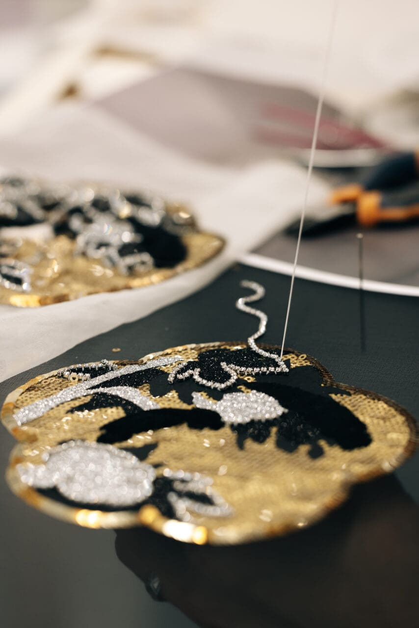在西湖夜色中熠熠生輝的還有以磷光紗線製作繡花織辮,經手繪處理營造光暗效果的作品,這些美妙而矚目的手工藝正是出自Montex刺繡工藝坊。專注於高級訂製時裝和奢華成衣刺繡的Montex於1949年在巴黎創立,於2011年正式加入Chanel高級手工坊。Montex工坊工匠聚焦革新物料及紋理質感,將傳統工藝與現代創意及創新技術完美融合,以打破想像的革新技藝重新詮釋工藝之美。