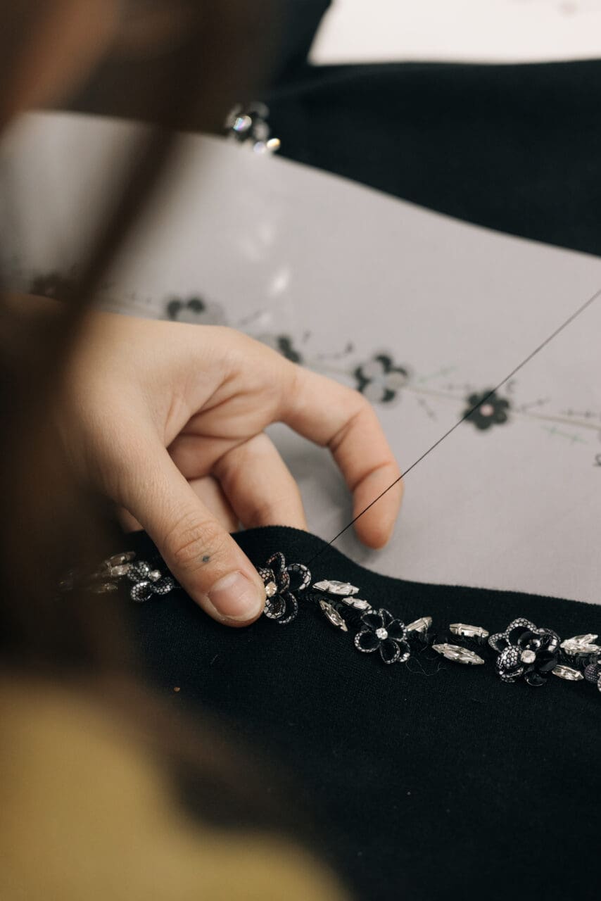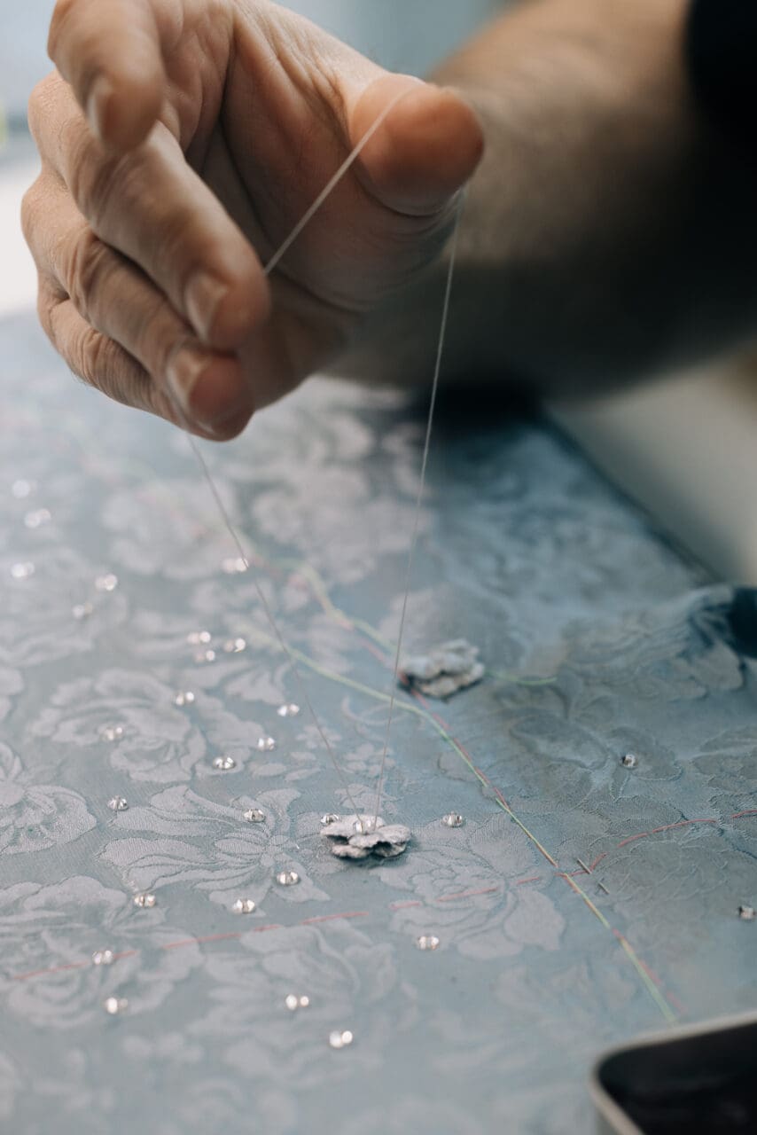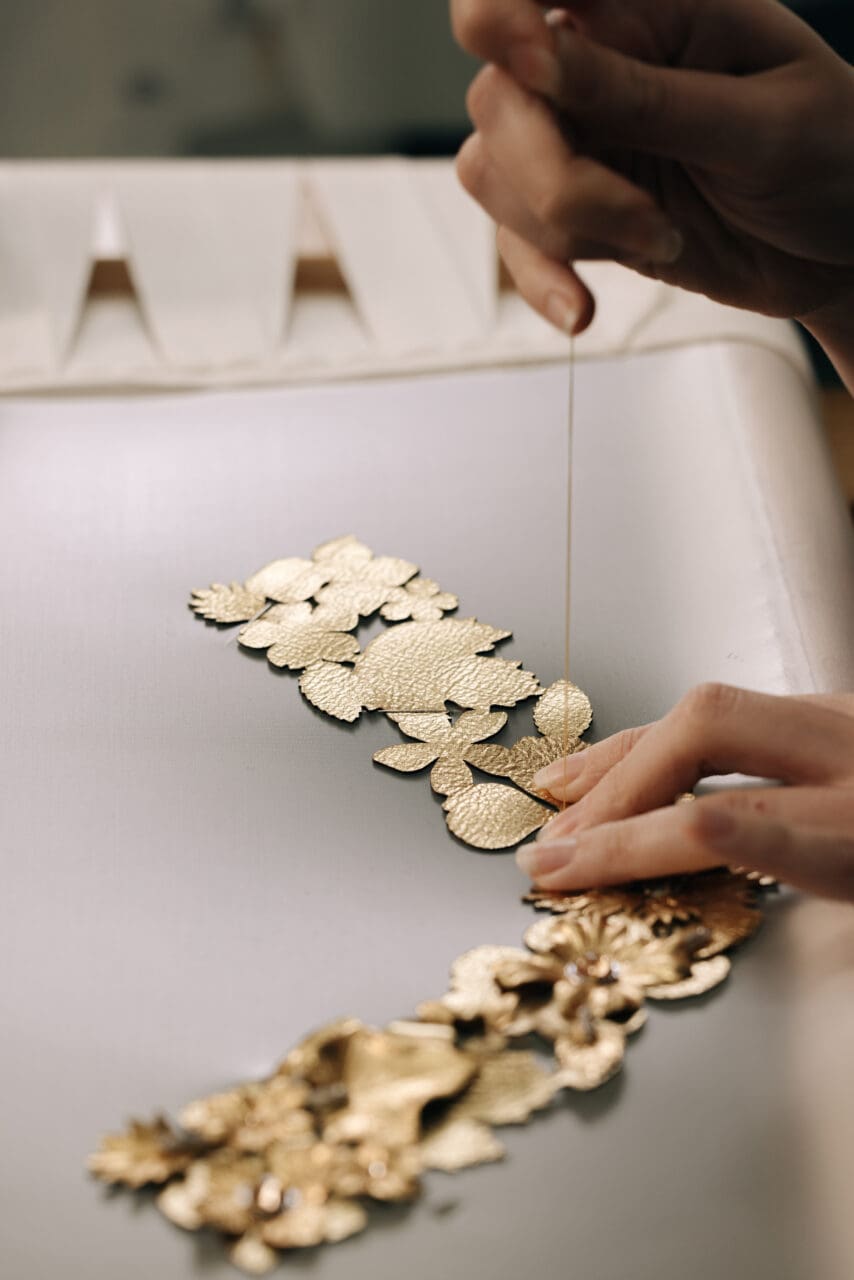 在西湖夜色中熠熠生輝的還有以磷光紗線製作繡花織辮,經手繪處理營造光暗效果的作品,這些美妙而矚目的手工藝正是出自Montex刺繡工藝坊。專注於高級訂製時裝和奢華成衣刺繡的Montex於1949年在巴黎創立,於2011年正式加入Chanel高級手工坊。Montex工坊工匠聚焦革新物料及紋理質感,將傳統工藝與現代創意及創新技術完美融合,以打破想像的革新技藝重新詮釋工藝之美。