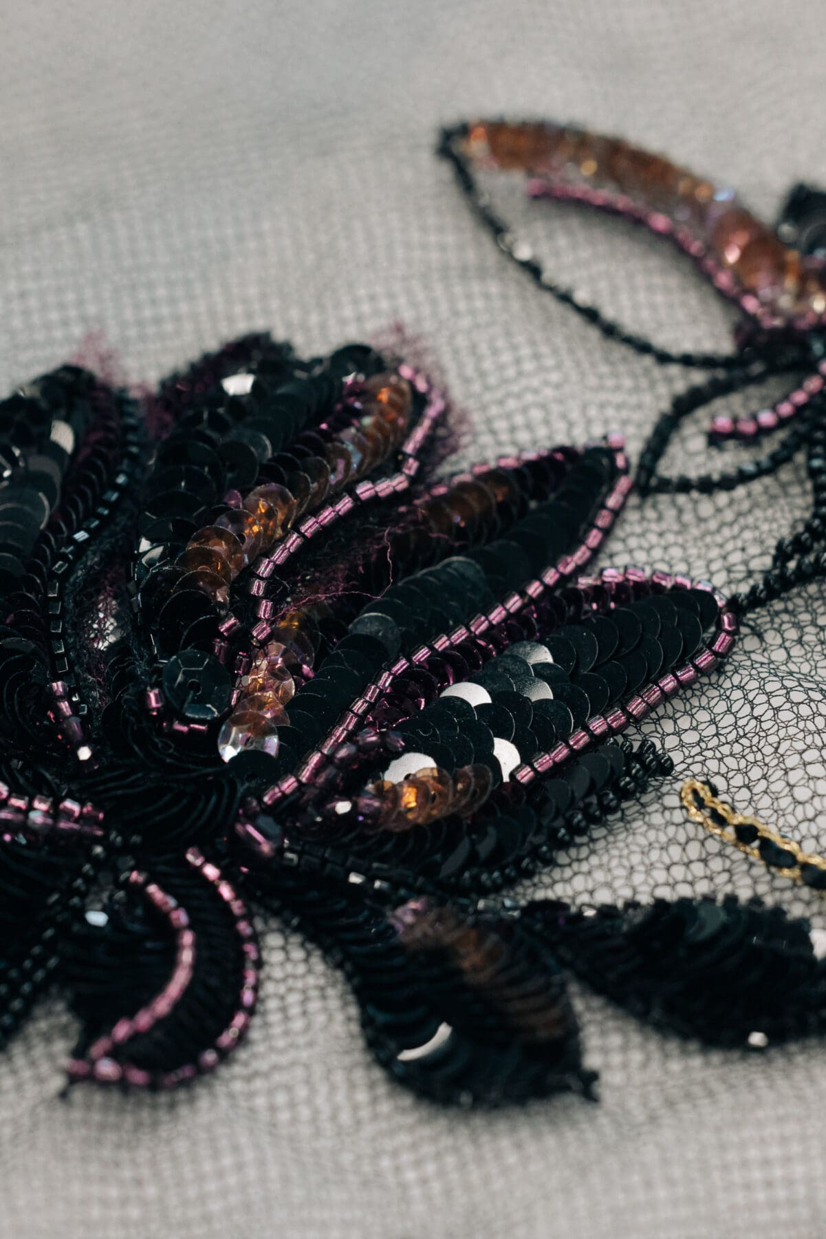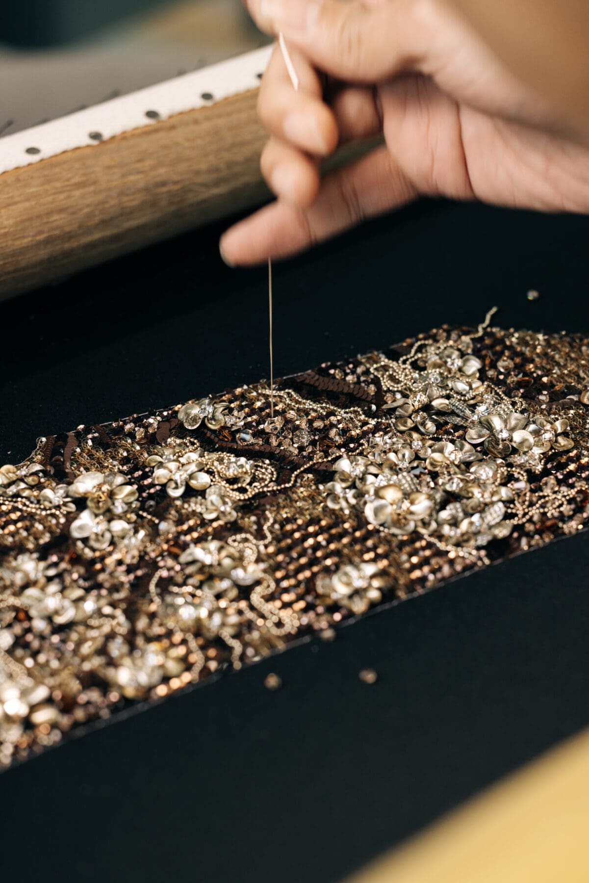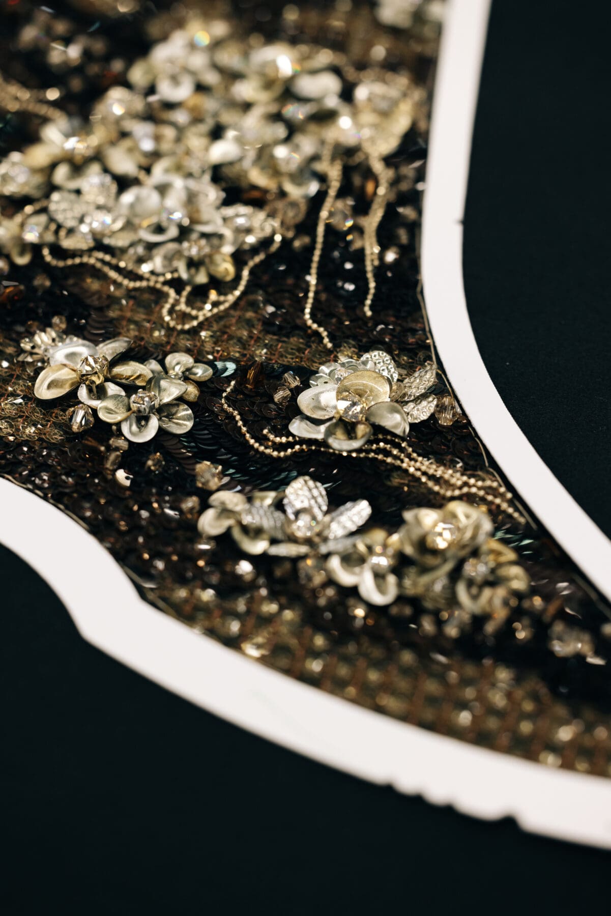 在西湖夜色中熠熠生輝的還有以磷光紗線製作繡花織辮,經手繪處理營造光暗效果的作品,這些美妙而矚目的手工藝正是出自Montex刺繡工藝坊。專注於高級訂製時裝和奢華成衣刺繡的Montex於1949年在巴黎創立,於2011年正式加入Chanel高級手工坊。Montex工坊工匠聚焦革新物料及紋理質感,將傳統工藝與現代創意及創新技術完美融合,以打破想像的革新技藝重新詮釋工藝之美。