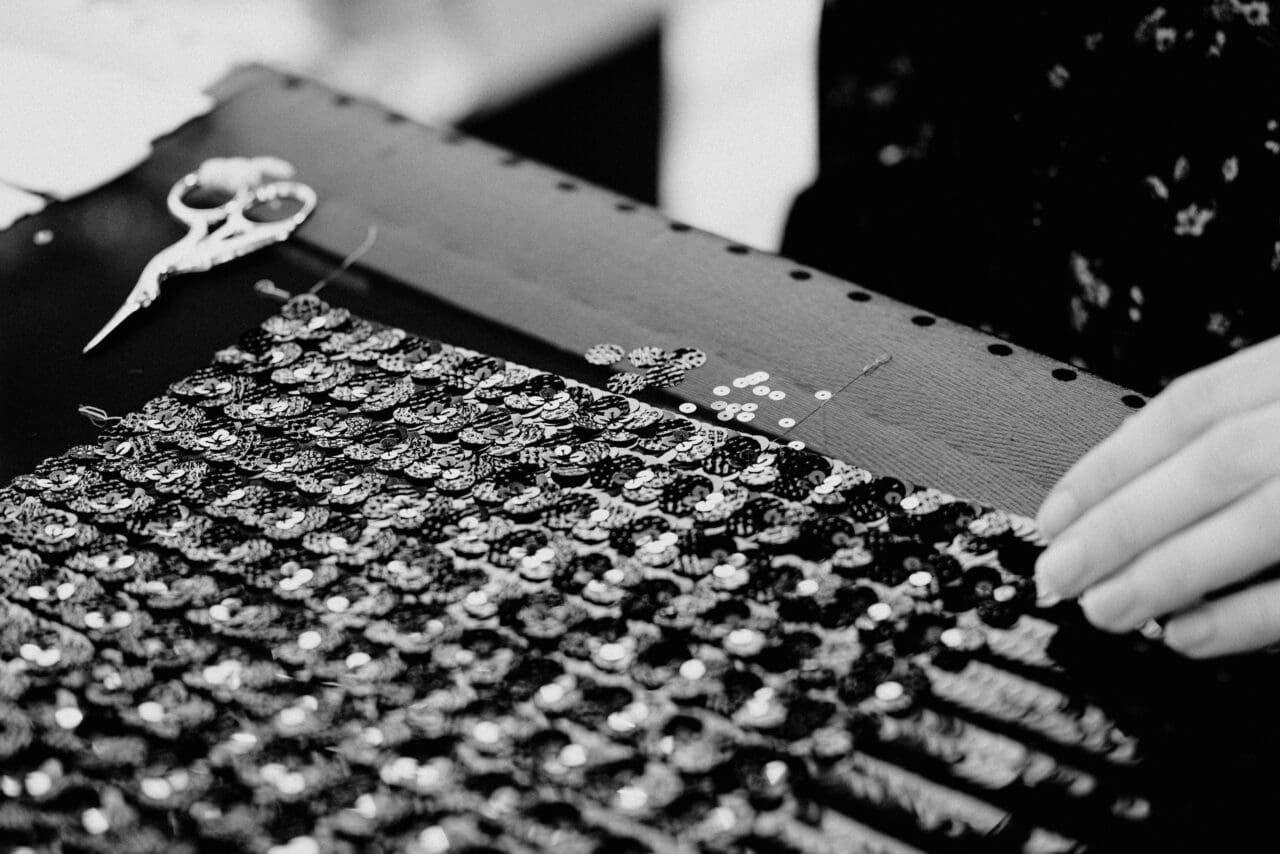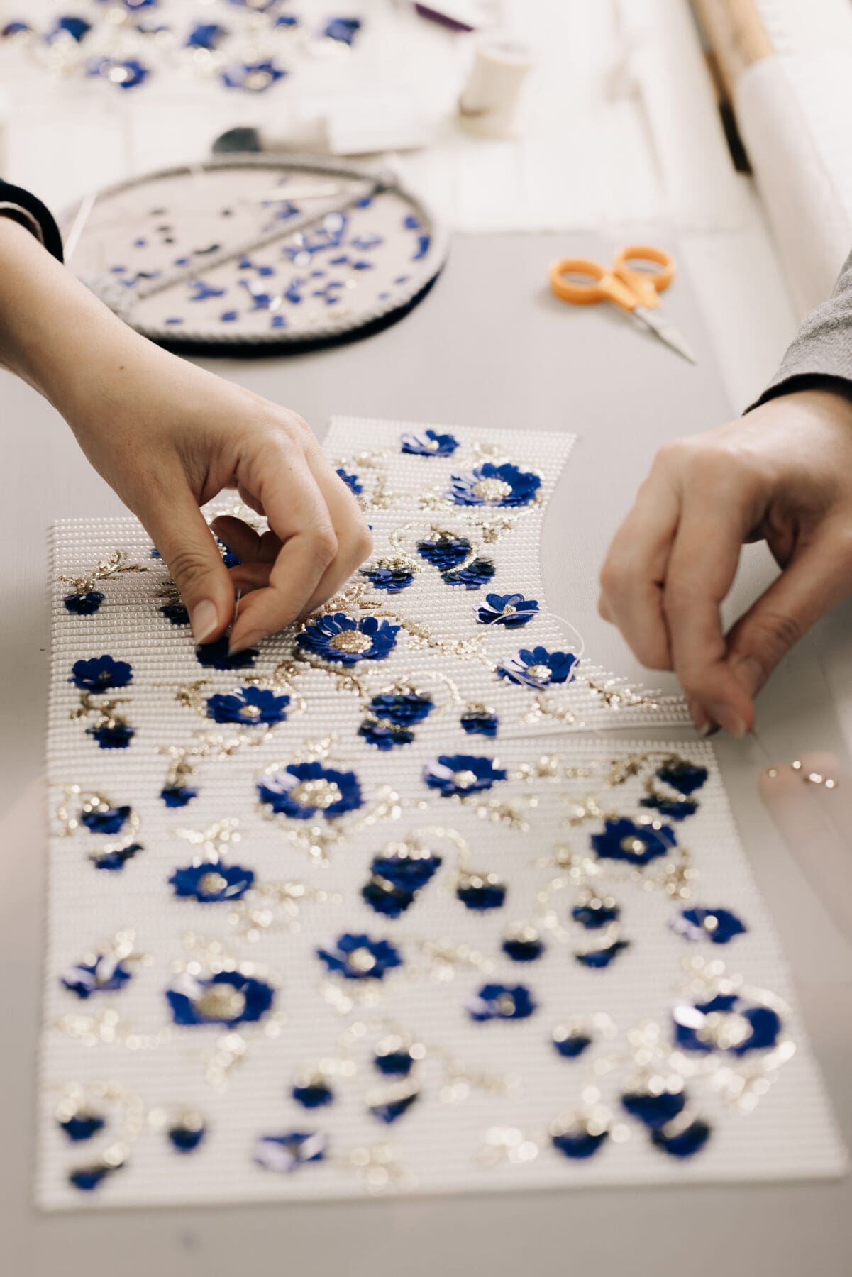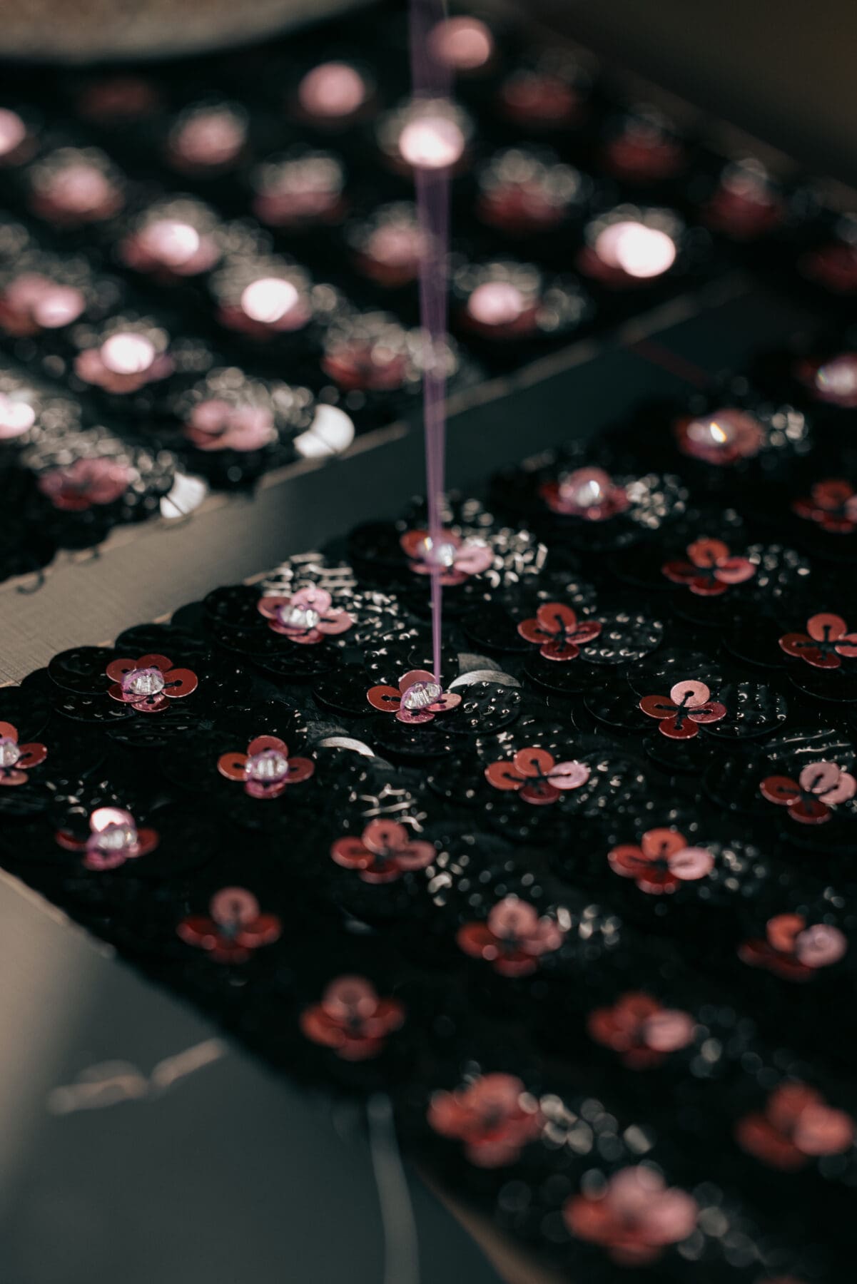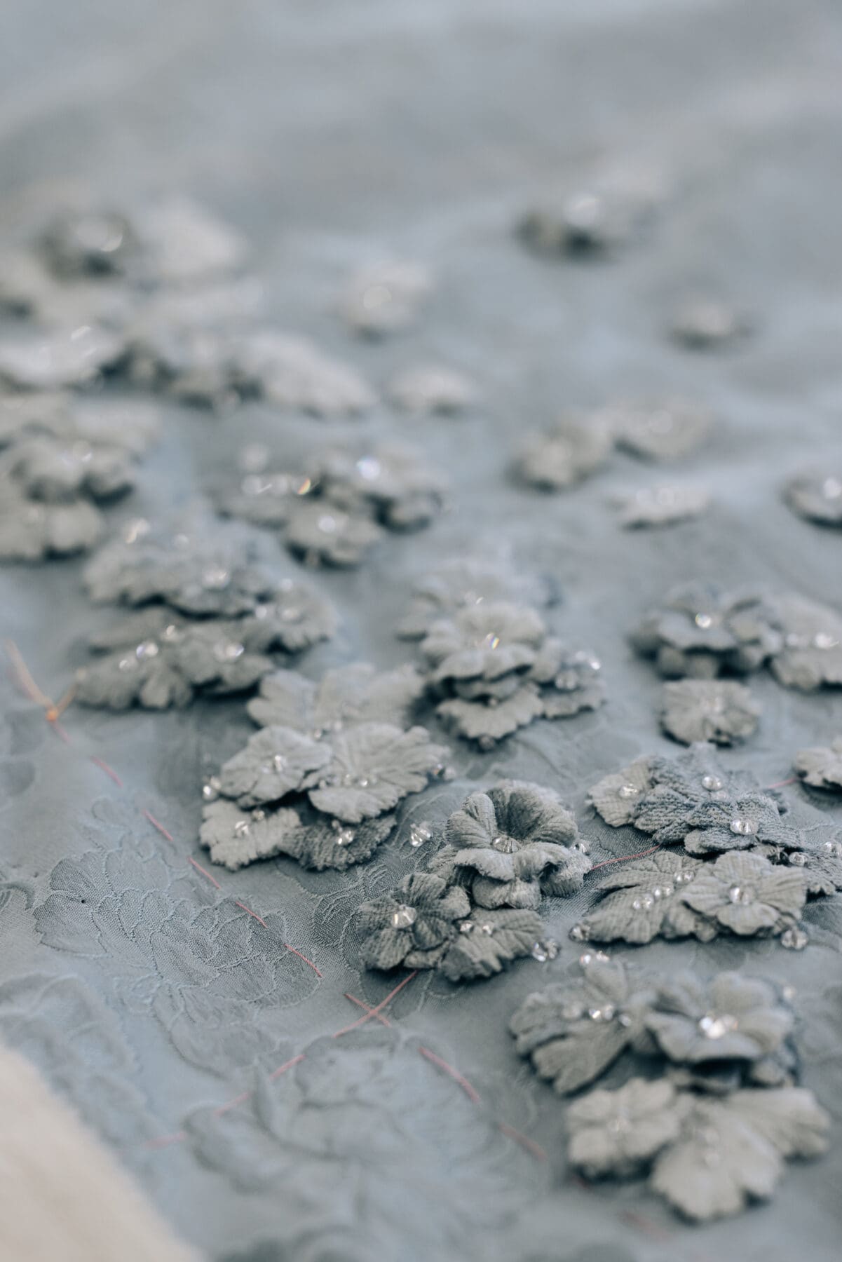 在西湖夜色中熠熠生輝的還有以磷光紗線製作繡花織辮,經手繪處理營造光暗效果的作品,這些美妙而矚目的手工藝正是出自Montex刺繡工藝坊。專注於高級訂製時裝和奢華成衣刺繡的Montex於1949年在巴黎創立,於2011年正式加入Chanel高級手工坊。Montex工坊工匠聚焦革新物料及紋理質感,將傳統工藝與現代創意及創新技術完美融合,以打破想像的革新技藝重新詮釋工藝之美。