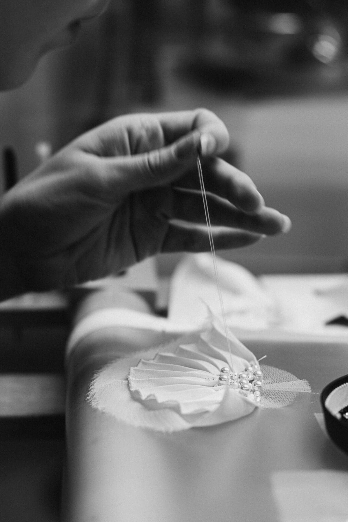Lognon褶飾工藝坊自2013年起成為Lemarié的一部分,其超卓的壓褶技術在新系列中引人注目。其中一款米白色絲緞外套由Lognon進行壓褶,隨後由Lemarié縫製褶襇並點綴上鏽色珠子,呈現出兩種不同闊度和紋路的扁褶,營造出立體的絎縫效果。而在時裝展的壓軸作品中,連身裙則結合了太陽射線紋和“au bonheur des dames”兩種壓褶,由Lemarié精心鑲嵌喱士、金銀絲線及金色珠子製作成最終光彩奪目的山茶花。精緻的褶襉與荷葉邊,刺繡與嵌花或亮漆面喱士,為系列注入一層浪漫色彩和感性魅力。