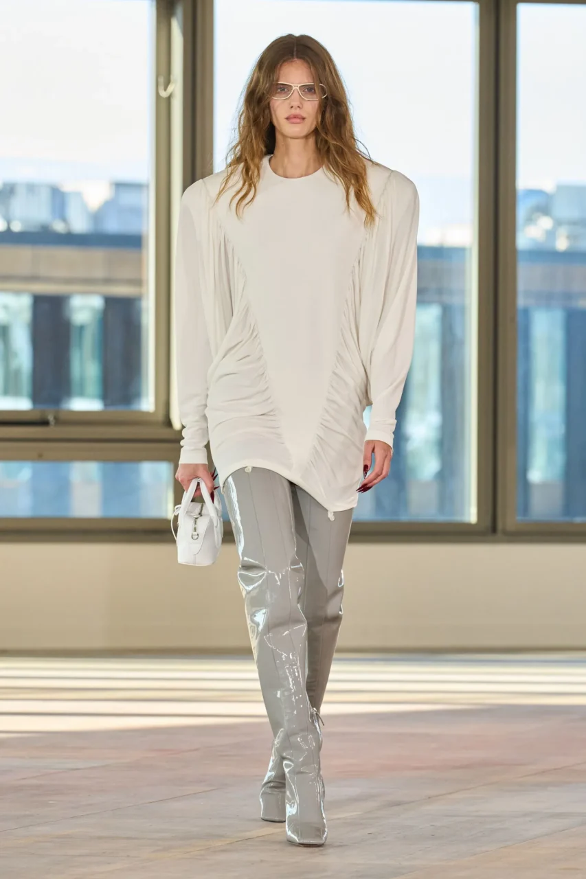 Acne Studios 則選擇以黑色大衣搭配過膝長靴,營造濃厚的暗黑風格;Alaïa 則偏愛酒紅色調的過膝長靴,配以純白色的兩件式套裝,展現優雅氣質;而 Khaite 則回歸經典廓形,採用典型的 2000 年代「靴筒收窄」穿搭術,向復古風潮致敬。