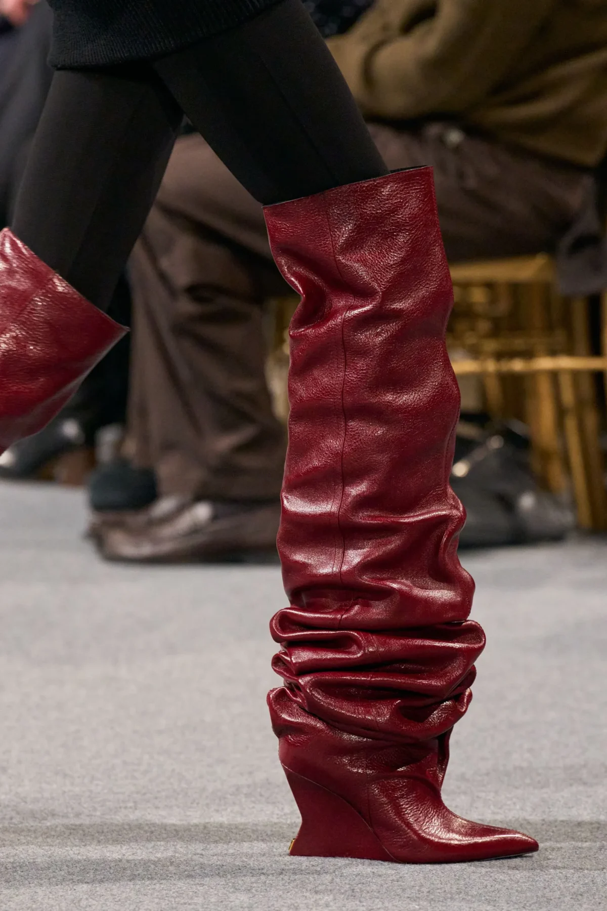 在 Balmain 2025 秋冬時裝展中,剛宣布即將離任的創意總監 Olivier Rousteing 打造了多套以酒紅與深色調過膝長靴為重點的造型。這些靴款採用慵懶的鬆垮靴筒設計,並巧妙地搭配厚底與尖頭細節,展現出品牌一貫的前衛風格。