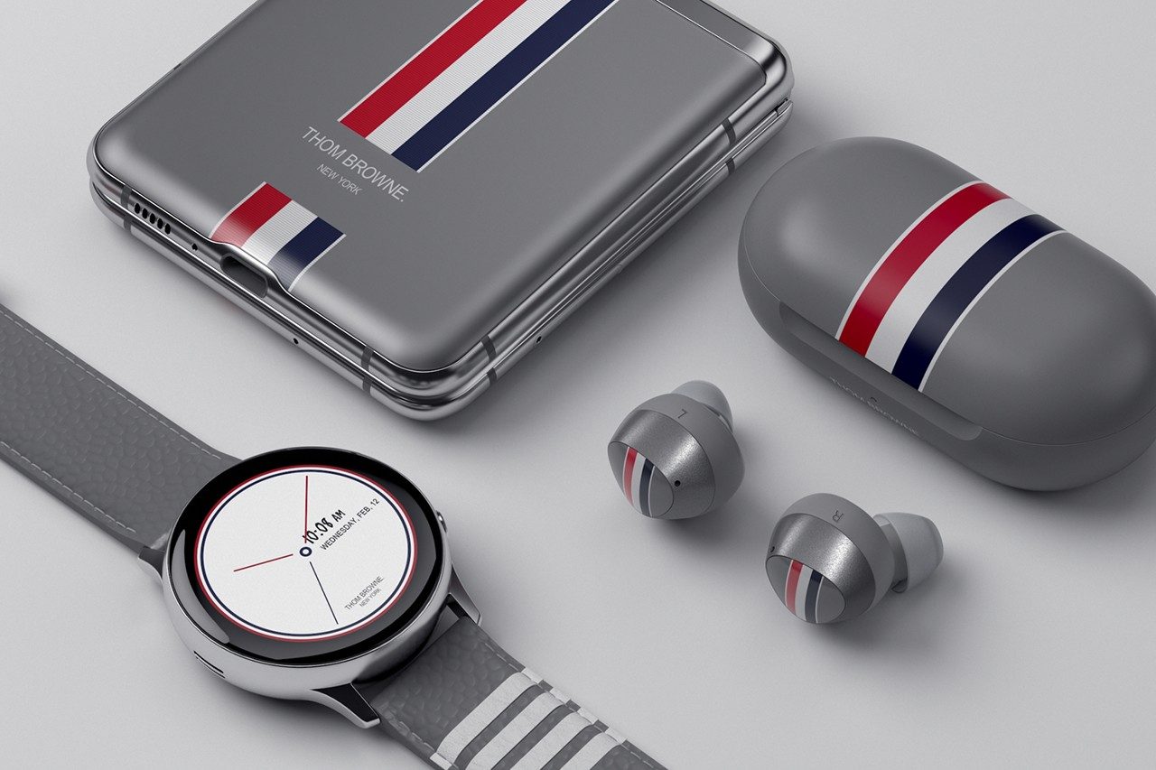 是次合作的主菜 Galaxy Z Flip 雖美,但周邊產品更教人驚喜。系列還推出了 Galaxy Buds + 與 Galaxy Watch Active2 的智能配件,糅合了 Thom Browne 品牌標誌性三色bar。