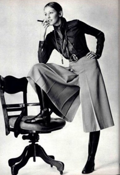 Horsebit馬銜扣、鍊式圖案、絲綢半截裙、真絲圍巾、高腰粗皮帶、蝴蝶領恤衫、三個骨闊身褲、商標肩袋……總而言之,組合起來的造型就是一種對巴黎休閒、馬術、城市生活的呼應——因為穿著者生活無憂,不須要常常抗議示威,才有閑情打扮成這種毫不憤怒、絕不挑釁的樣子。